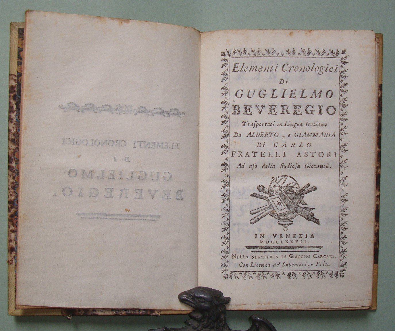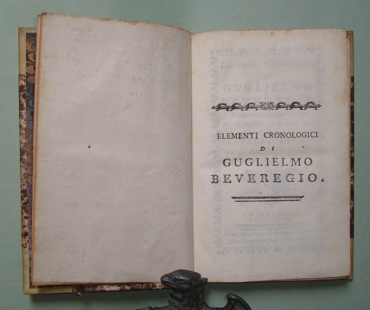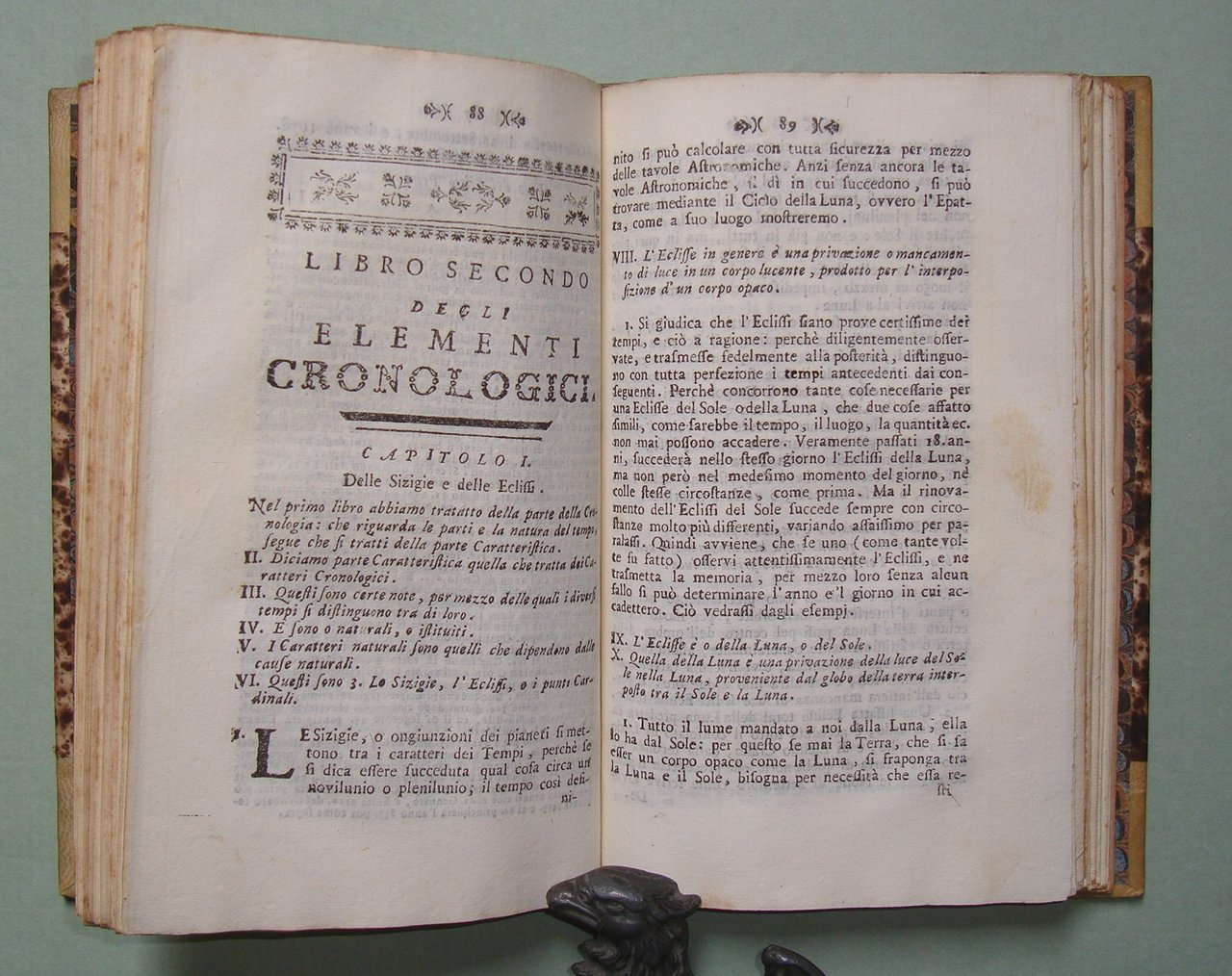 In Venezia, nella Stamperia di Giacomo Carcani, 1777. In 16mo; pp.XII,191. Mezza pergamena posteriore con angoli. Della cronologia, del tempo, del minuto o soropolo. L’anno Gregoriano, Persiano, Etiopico etc. Degli Equinozj e dei Solstizj, del Cielo e del Sole, le Eclissi, etc.