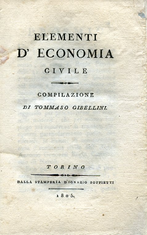 In-8° (210x133mm), pp. XII, 389, brossura originale. Intonso e a fogli chiusi, con bruniture leggere quanto usuali. Ottimo stato. Prima ed unica edizione, assai rara, di questo trattato di economia civile composto dal Gibellini. L'opera, fondata in buona parte sulle 'Lezioni di economia' del Genovesi, qui integrate e aggiornate in riferimento alla situazione piemontese, discorre dei corpi politici, della popolazione e della demografia, dell'educazione, della nutrizione, 'o sia come i mezzi d'essa, ristrettissimi nella prima età delle Nazioni, si andarono aumentando nelle altre età successive', del lusso, delle classi improduttive, della povertà e della mendicità, delle rendite delle nazioni, dei progressi dell'industria, del commercio, delle annone, delle finanze. del valore, delle monete, delle usure, della circolazione del denaro, del credito pubblico, della cartamoneta, delle fede pubblica, dei cambi e degli aggi, dei bilanci generali del commercio, della ricchezza, della polizia, dell'ordine pubblico. I principi economici genovesiani vengono illustrati e sviluppati ai fini di una loro più agevole penetrazione nel corpo della pubblica amministrazione piemontese. Il Gibellini (Torino, 1735-1816) fu dapprima Senatore e poi Presidente del Senato di Torino e Presidente Capo del Magistrato del Consolato di Torino. Sirugo, n. 671. Einaudi, 2550. Cossa, p. 5, n. 15. Ricca-Salerno, p. 366: 'Tommaso Gibellini espone le regole principali dell'arte finanziaria sulle tracce del Genovesi; dice che l'ottimo finanziere deve promuovere con ogni mezzo la ricchezza del popolo e così rendere agevole il pagamento dei tributi'. Goldsmiths'-Kress, n. 19011.6. OCLC, 16187776.