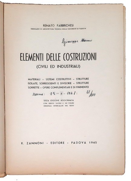 Elementi delle costruzioni (civili e industriali). III edizione aggiornata con XXXVIII tavole e 190 figure originali intercalate nel testo.