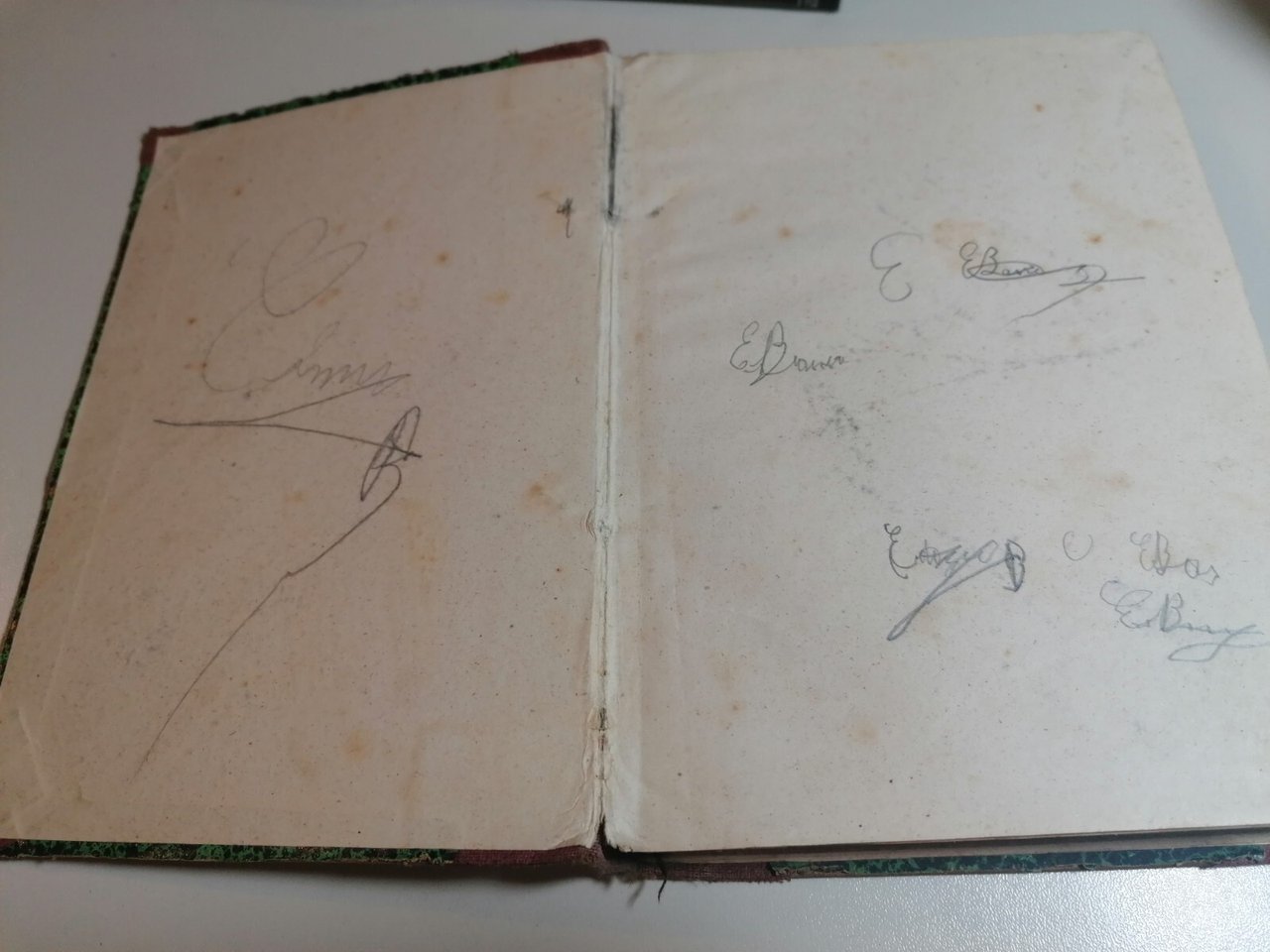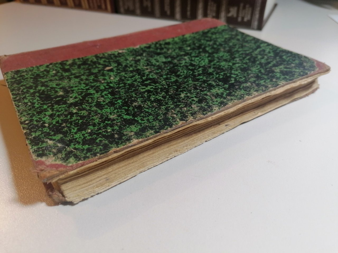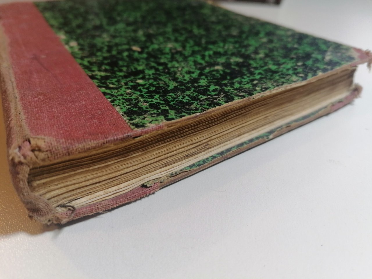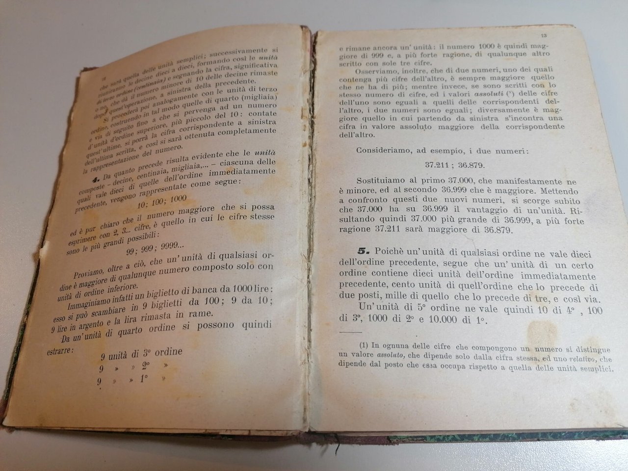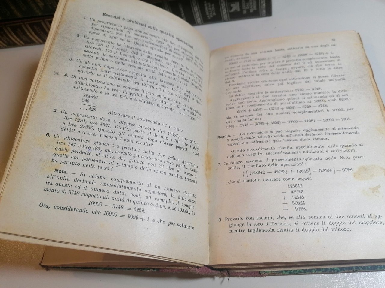Signorelli, 1914 Legatura in tela, piatti marmorizzati, in 8^, 326 pp. Sistema decimale, radici, numeri complessi, operazioni, numeri primi e frazionari, proporzioni. Condizioni: scadenti, compatibilmente con l'età (scarabocchi, fioriture, macchie). 1G-7-8