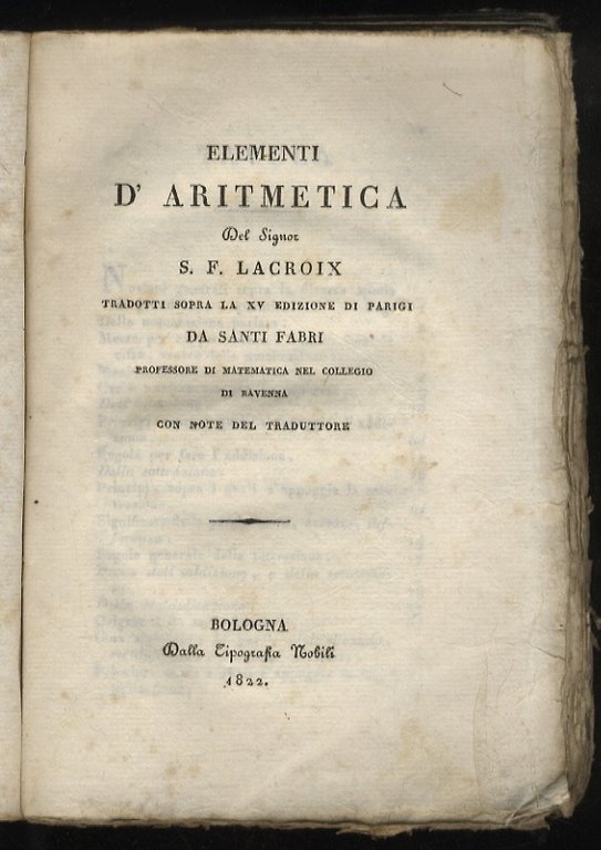 Elementi di calcolo del signor S.F. Lacroix. Tomo I: Elementi d'aritmetica [- tomo II: Elementi d'algebra].