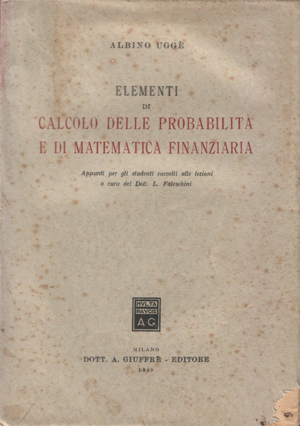 In-8°, pp. (4), 370, (2), copertina editoriale con qualche segno d'uso e del tempo (macchioline d'umido) e una mancanza nell'angolo inferiore destro della copertina anteriore (vedi foto). Qualche segno d'umido, alcuni appunti a matita, per il resto buon esemplare parzialmente intonso. Indice: Avvertenza; Parte I. Calcolo delle probabilità; Parte II. Matematica finanziaria; Parte III. Matematica attuariale; Tavole; Indice analitico.