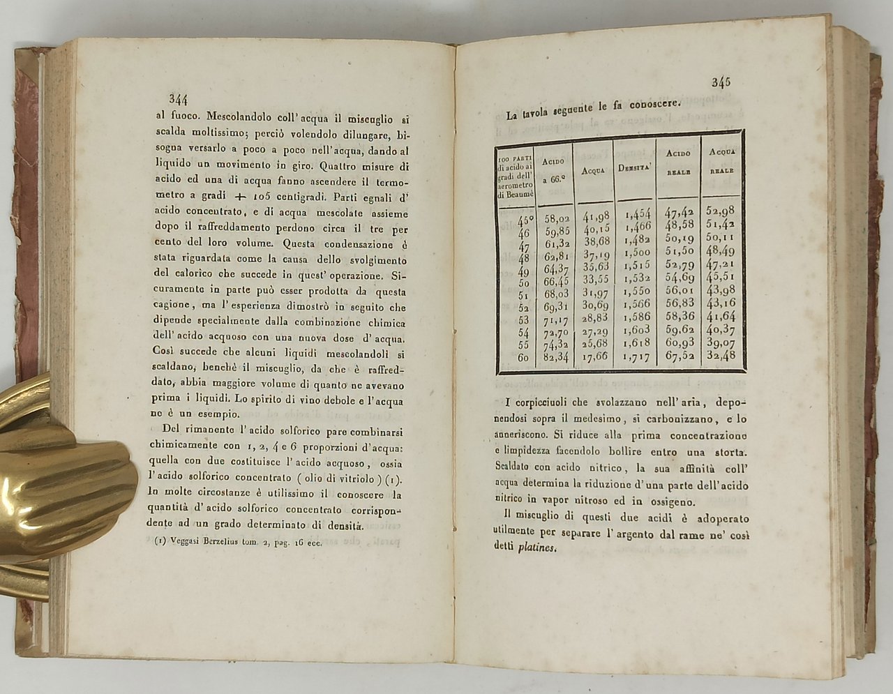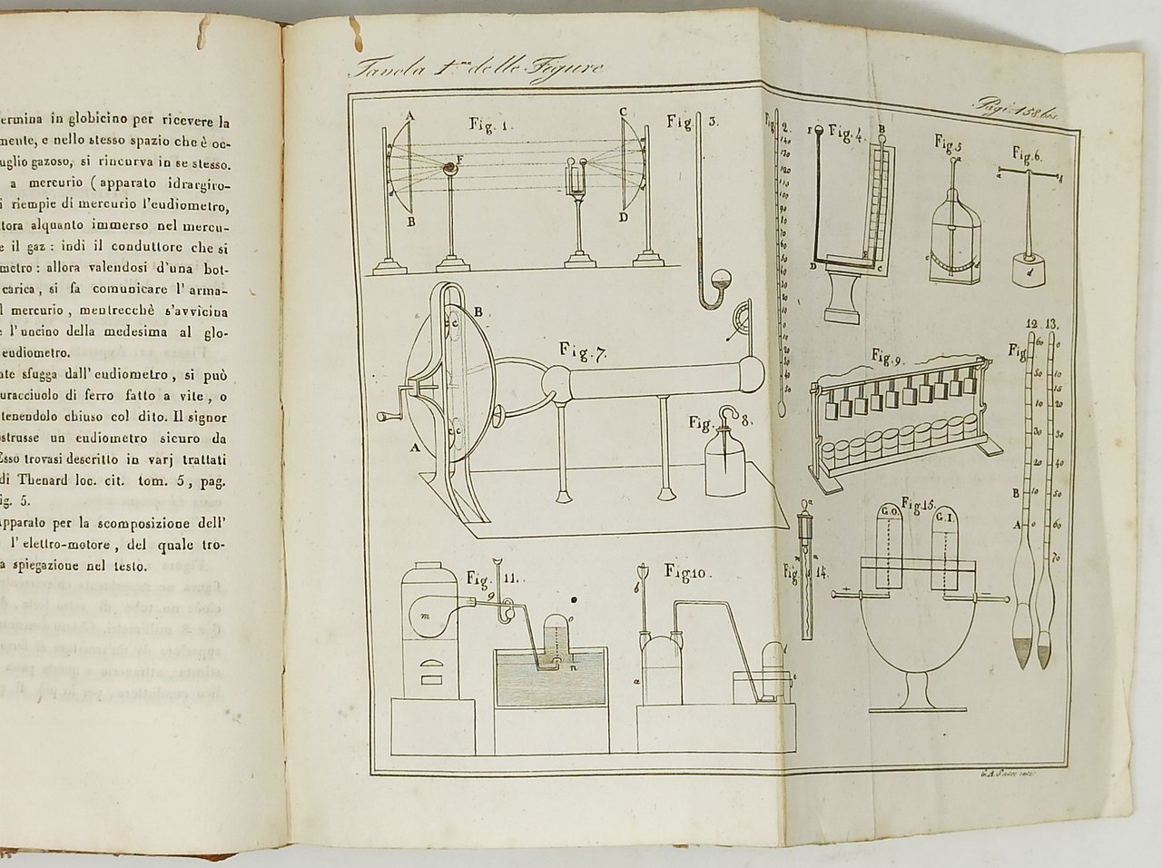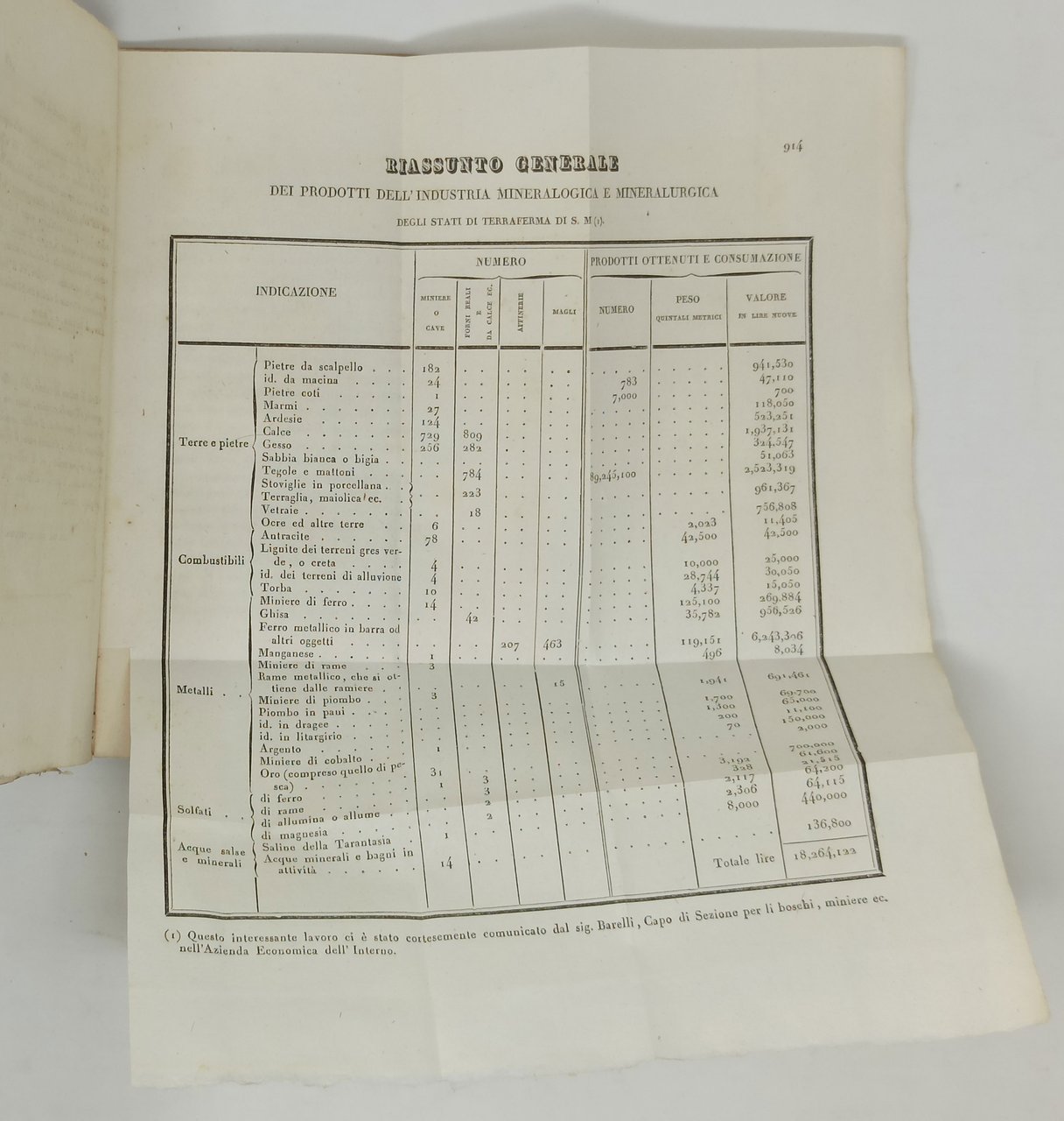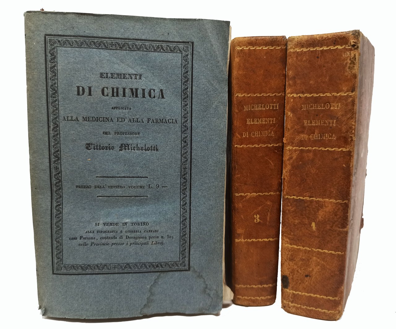 Opera completa: Due volumi in tre tomi (il Volume primo in un solo tomo, il Volume secondo diviso in due tomi distinti). 1831 - 1834. Dimensioni di ciascun volume: 12,5 x 20 cm circa. Il volume Primo contiene, al suo interno, due tavole incise in rame fuori testo e 14 tavole contenenti tabelle, fuori testo, più volte ripiegate su se stesse (a causa delle dimensioni) mentre, nel volume Secondo, sono presenti una tavola incisa (la terza) e un'altra tavola con tabella fuori testo e piùvolte ripiegate su se stesse. Stato di conservazione: Marcati segni del tempo e dell'uso sulle copertine del Volume Primo e del Tomo Primo del Volume Secondo: vi sono delle mancanze e degli strappi sul rivestimento dei piatti in cartone (rivestimento in parte scollato). Leggero allentamento della rilegatura, in corrispondenza dell'attaccatura del piatto postreiore del Primo volume al corpo del libro. Qualche rara ed ordinaria macchiolina della carta. Mancano le ultime pagine dell'indice del Volume Primo (l'inidice fa, come ultimo, riferimento alla pagina 316 del Capo VI facendo così concludere il tomo a pagina 516 anzichè a pagina 527). Scendendo nel dettaglio, segnaliamo: Volume Primo: Aloni marroncini (che, comuque, non compromettono la lettura del testo) sulle due pagine frontali 124-125 (causate da delle foglioine secche conservate, in passato, all'interno di questo volume, tra queste due pagine frontali). Un piccolo segno di tarma sul margine superiore (bordo bianco) delle pagine che vanno dalla numero 123 alla 412 (tra queste è presente anche la prima tavola illustrata); con anche alcuni forellini centrali sul foglio che contiene le due pagine 407-408 che, però, non compromettono la lettura del testo. Segni di china (?) sul margine inferiore (bordo bianco) delle due pagine frontali 414-415. Volume Secondo / Tomo Primo: un alone (di colore marroncino) sul margine inferiore (bordo bianco) del foglio che contiene le due pagine 163-164 e dei 6 fogli che contengono le pagine 235-242. Tomo Secondo / Volume Secondo: un leggero alone sul margine bianco inferiore di pagina 915 e aloni (probabilmente tutti causati da una pregressa umidità) anche sul margine inferiore della copertina anteriore e di quella posteriore. Pagine ancora completamente intonse (solo per questo tomo). Nel complesso si tratta di tre buoni esemplari: molto freschi e privi di firme d'appartenenza, timbri, appunti, sottolineature o altri segni nel testo. Il Tomo Secondo del Volume secondo, per scelta editoriale, non presenta un frontespizio e la numerazione delle pagine riprende quella del tomo primo (si veda la fotografia n. 10 sopra riportata). Si segnala che, stranamente, a causa probabilmente di un errore di stampa, il Tomo Primo del Volume Secondo (quello con rilegatura rigida), sul dorso ha stampato il numero '3' (si tratta, invece, del tomo due, successivo al volume primo e antecedente al tomo Secondo del volume Secondo). Si tratta di una delle più Importanti opere ottocentesche nel campo della chimica metallurgica. Il Prof. Vittorio Michelotti fu un illustre chimico e mineralogo piemontese. Insegnò chimica medica e farmaceutica nella R. Università di Torino e metallurgia nella Regia Scula delle Miniere di Moutiers. Al fondo del volume Secondo è presente una tavola intitolata 'RIASSUNTO GENERALE DEI PRODOTTI DELL'INDUSTRIA MINERALOGICA E MINERALURGICA DEGLI STATI DI TERRAFERMA DI S.M.'