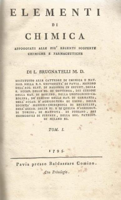 Baldassarre Comino, Pavia, 1795. Tomo I. In 8vo, pp. XIX, 108 compresi gli indici (Sinonimia Antica e nuova e riformata, disposta per ordine alfabetico), 7 tavv. in b/n rip. in fine f. t. ("Brugnatelli delin. Cagnoni scul.") e raffiguranti forni, alambicchi, termometri e strumenti scientifici vari, leg. orig. ma restaurata e rimontata, perg. al dorso e punte, piatti in cartonato rivestiti in carta marmorizzata. Ottima opera dello scienziato pavese (1761 - 1818) allievo di Spallanzani e Scopoli e, più tardi, amico di Alessandro Volta (con lui intraprese il celebre viaggio a Parigi al fine di illustrare l'invenzione della pila elettrica). L'opera completa si compone di tre volumi (precede l'opera il "Vocabolario della nuova nomenclatura chimica riformata ed accresciuta da L. Brugnatelli"). Molto interessante per lo studio della condizione della chimica italiana all'epoca e affatto comune. Segni alla legatura ma, tranne un leggerissimo e sporadico foxing, ben conservato l'interno con le tavole.
