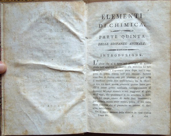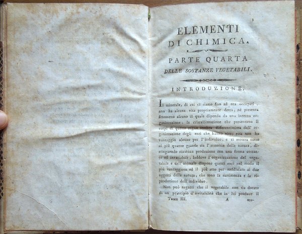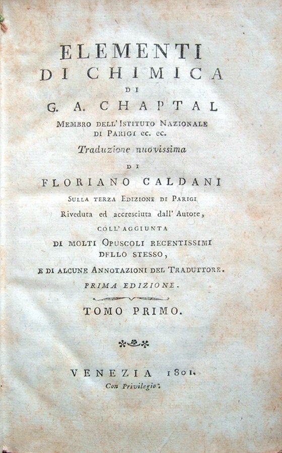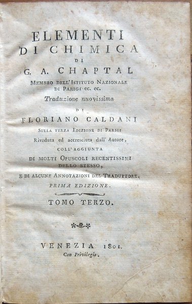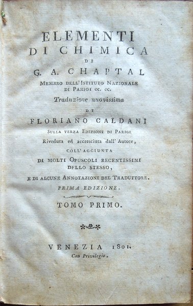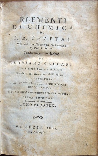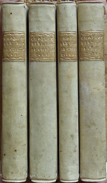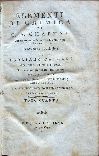 Elementi di chimica di G. A. Chaptal, membro dell'Istituto Nazionale di Parigi ec. ec. Traduzione nuovissima di Floriano Caldani sulla terza edizione di Parigi riveduta ed accresciuta dall'Autore . Prima edizione. Tomo primo (- quarto)