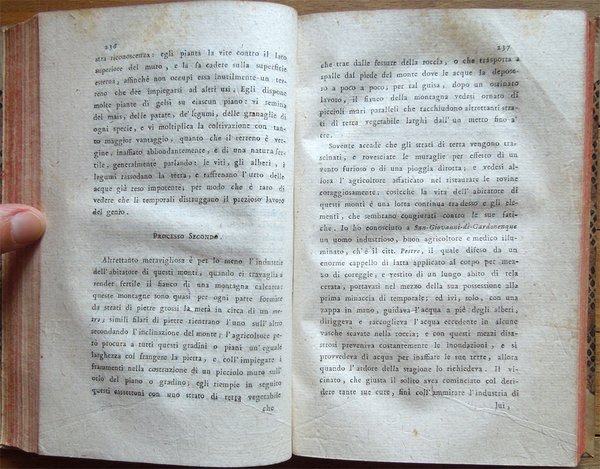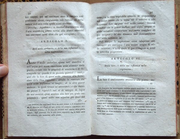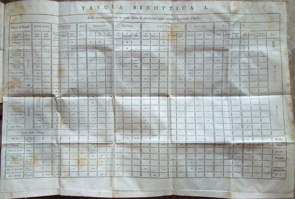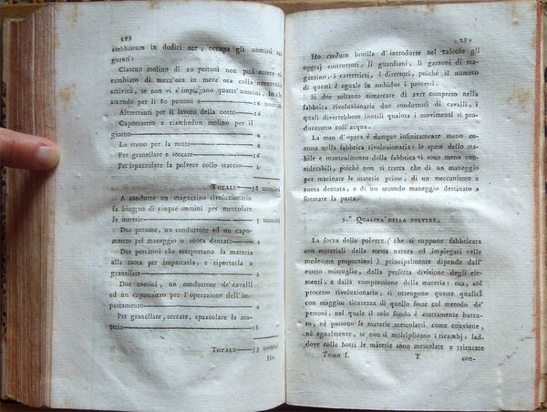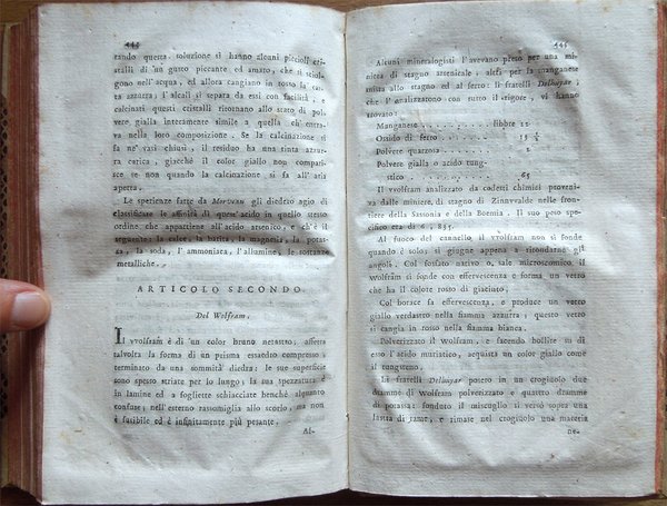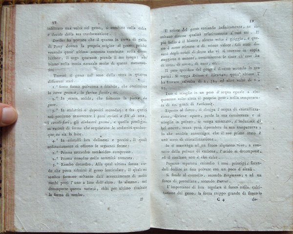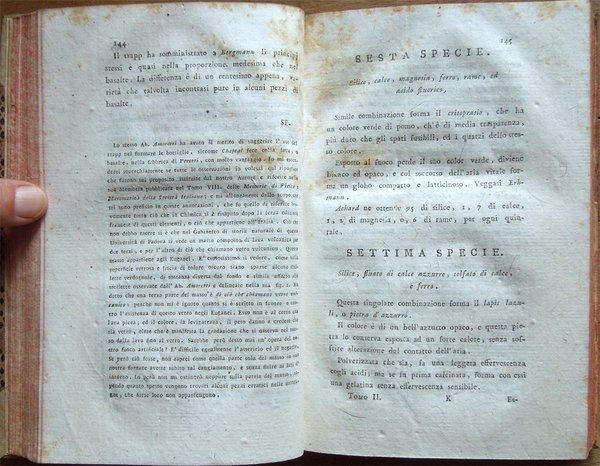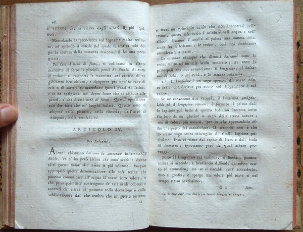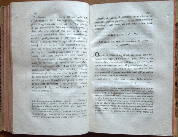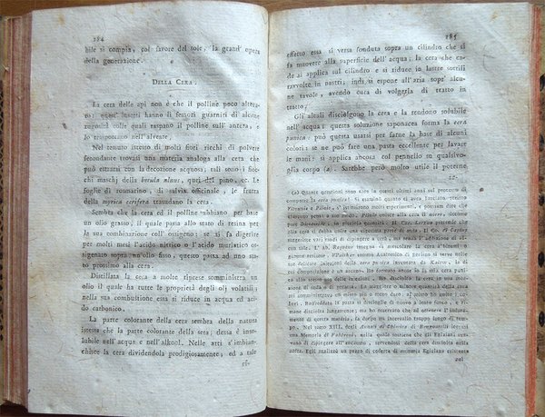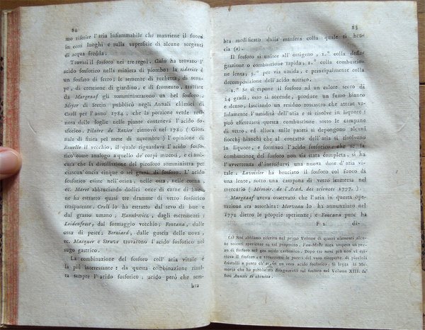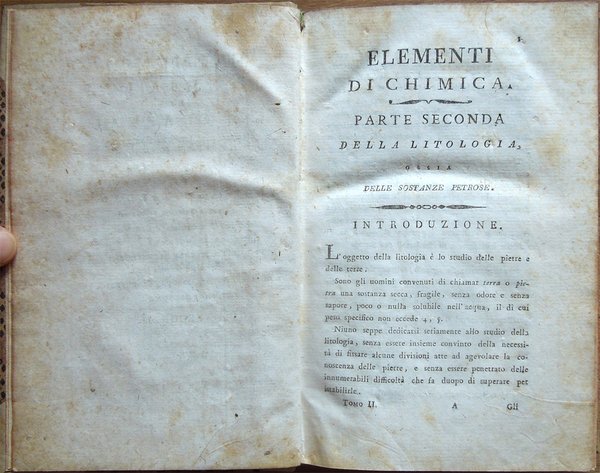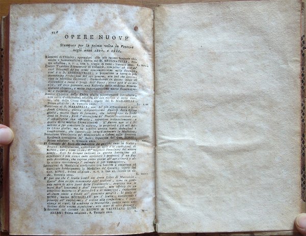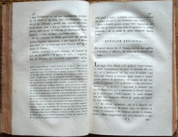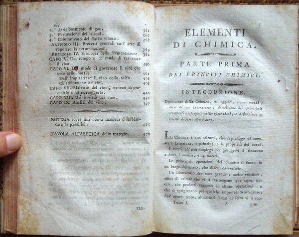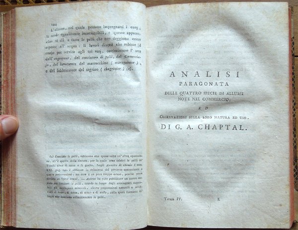 Quattro volumi in-16° (18,7 x 11,7 cm), pp. (8), CIV, 342; (4), 478 (2); (4), 336; (4), (2), 526, bella legatura coeva in mezza pergamena con angoli, titoli in oro su tassello al dorso, tagli rossi. Con 5 grandi tavole sinottiche più volte ripiegate, 2 poste in fine del primo tomo e 3 in fine del secondo, intitolate "Delle sostanze contenute in cento libbre di ciaschedun'acqua minerale e termale d'Italia" (Tavola I. Regno di Napoli e Stato della Chiesa; Tavole II - III Stato di Toscana; Tavola IV Stato di Modena, Stato Veneto, Stato di Milano, Tavola V Torinese e Grigioni). Ex libris alla prima carta bianca dei primi tre tomi e alla guardia anteriore del quarto. Nel quarto volume, errore compiuto dal legatore nell'impaginazione dell'ultimo fascicolo, con gli indici, ma testo corretto e completo. Qualche leggero segno d'umido alle tavole e ad alcune pagine, per il resto esemplare ben conservato. Prima edizione italiana di una delle più significative e diffuse opere sulla chimica tra il XVIII e il XIX secolo. Da segnalare, nel tomo quarto, un importante e ampio trattato sui vini (pp. 289-463). L'opera è così suddivisa: Tomo Primo. Parte Prima. Dei principi chimici. Tomo Secondo. Parte Seconda. Della litologia, ossia delle sostanze petrose. Prima classe: Della combinazione delle terre cogli acidi; Seconda Classe: Della combinazione e del miscuglio delle terre primitive fra loro, ossia de' miscugli terrei; Terza Classe: Della mescolanza delle pietre fra loro. Miscugli petrosi. Roccie; Parte Terza. Delle sostanze metalliche. Cap. I. Dell'Arsenico; Cap. II. Del Cobalto; Cap. III. Del Nickel; Cap. IV. Del Bismuto; Cap. V. Dell'Antimonio; Cap. VI. Dello Zinco; Cap. VII. Del Manganese; Cap. VIII. Del Piombo; Cap. IX. Dello Stagno; Cap. X. Del Ferro; Cap. XI. Del Rame; Cap. XII. Del Mercurio; Cap. XIII. Dell'Argento; Cap. XIV. Dell'Oro. Cap. XV. Della Platina; Cap. XVI. Del Tunstene e del Wolfram; Cap. XVII. Del Molibdeno. Tomo Terzo. Parte Quarta. Delle sostanze vegetabili. Sez. I. Della struttura del vegetabile; Sez. II. De' principi nutritivi del vegetabile; Sez. III. Del risultato della nutrizione, ossia de' principi del vegetabile; Sez. IV. De' principi ch'escono colla traspirazione della pianta; Sez. V. Delle alterazione che provano li vegetabili morti. Tomo Quarto. Parte Quinta. Delle sostanze animali. Cap. I. Della digestione; Cap. II. Del latte; Cap. III. Del sangue; Cap. IV. Del grasso; Cap. V. Della bile; Cap. VI. Delle parti molle e bianche degli animali; Cap. VII. De' muscoli o parti carnose; Cap. VIII. Dell'orina; Cap. IX. Del fosforo; Cap. X. Dello sperma umano; Cap. XI. Delle lagrime e del muco delle narici; Cap. XII. Della sinovia; Cap. XIII. Di alcune sostanze che si traggono dagli animali ad uso della medicina e delle arti. Cap. XIV. Di alcuni altri acidi estratti dal regno animale; Cap. XV. Della putrefazione; Cap. XVI. Della concia de' cuoi. Osservazioni varie; Trattato sui vini. Cap. I. Del vino considerato ne' suoi rapporti col suolo, col clima, colla plaga, colle stagioni, colle coltivazioni; Cap. II. Del tempo più favorevole alla vendemmia, e de' modi di farla; Cap. III. De' modi di disporre il vino alla fermentazione; Cap. IV. Della fermentazione; Cap. V. De' tempi e del modo di travasare il vino; Cap. VI. Del modo di governare li vini che sono nelle botti; Cap. VII. Malattie del vino, e modi di prevenirle o di correggerle; Cap. VIII. Usi e virtù del vino; Cap. IX. Analisi del vino. Jean Antoine Chaptal, insigne chimico e uomo politico francese (Nojaret Lozère 1756 - Parigi 1832), svolse un'importante attività tesa all'applicazione dei metodi chimici nell'industria e nell'agricoltura. Professore di chimica a Montpellier, creò la prima fabbrica francese per la produzione di acido solforico e allume artificiale. Nel 1793 ottenne la direzione dei laboratori di Nogaret per la produzione di polvere da sparo. Successivamente fu incaricato dei corsi di chimica vegetale alla scuola politecnica. Dopo essere stato chiamato al Consiglio di Stato, fu nominato ministro degli interni (1800-1804) e come tale fondò le camere di commercio, le scuole di arti e mestieri, creò la prima rete di canali francese e diede nuovo impulso allo sviluppo della rete stradale. Venne insignito da Napoleone di varie onorificenze e del titolo nobiliare. Titolo completo: Elementi di chimica di G. A. Chaptal, membro dell'Istituto Nazionale di Parigi ec. ec. Traduzione nuovissima di Floriano Caldani sulla terza edizione di Parigi riveduta ed accresciuta dall'Autore, coll'aggiunta di molti Opuscoli recentissimi dello stesso, e di alcune Annotazioni del Traduttore. Prima edizione. Tomo primo (- quarto).