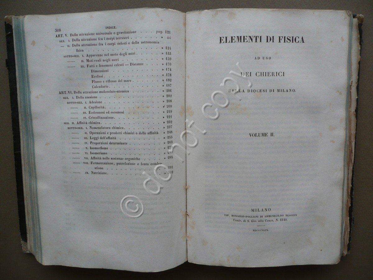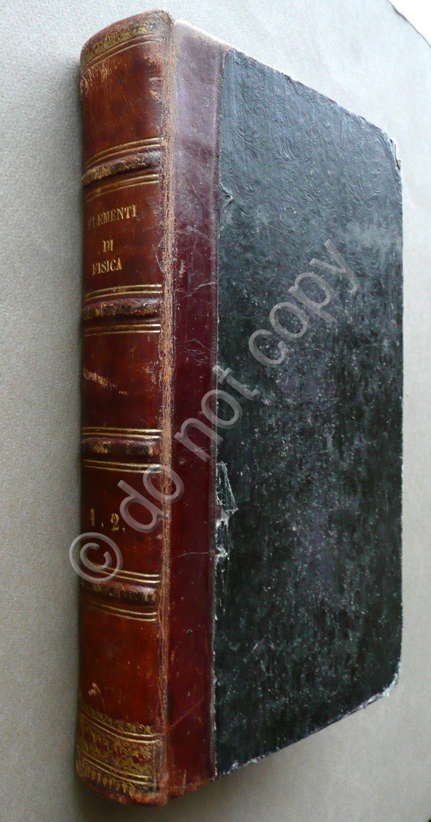 Elementi di Fisica ad uso dei Chierici della Diocesi di Milano **** Elementi di Fisica ad uso dei Chierici della Diocesi di Milano volume II Tip. Boniardi-Pogliani di Ermenegildo Besozzi, Milano 1848-49, cm 24x15,5, pp. 308 (primo volume); pp. 128 (secondo volume), con 32 belle tavv. incise in b/n e rip. più volte al termine del volume, legatura d'epoca in mezza pelle, titolo e alcuni fregi impressi in oro al dorso con nervature, piatti in cartonato, tagli azzurri. Condizioni di conservazione Esemplare in buone condizioni con tracce d'uso, coperta con alcune lievi irregolarità e abrasioni, margini e angoli dei piatti con alcuni piccoli strappetti e mancanze. Interni buoni con minmi difetti ai margini e agli angoli e qualche lieve brunitura, due lievi ombre di gore rispettivamente al margine inf. di varie pagine e alle tavole, le quali non interessano il testo e non compromettono le illustrazioni, tavole con minime pieghette e difetti ai margini e agli angoli, mancanza di circa metà della tavola 25, con parte restante staccata dal testo (vedi foto). Opera completa in due volumi contenuti entro un unico tomo. Presenza di 32 belle tavole incise e ripiegate più volte al termine del testo. SETT74.L6522 N