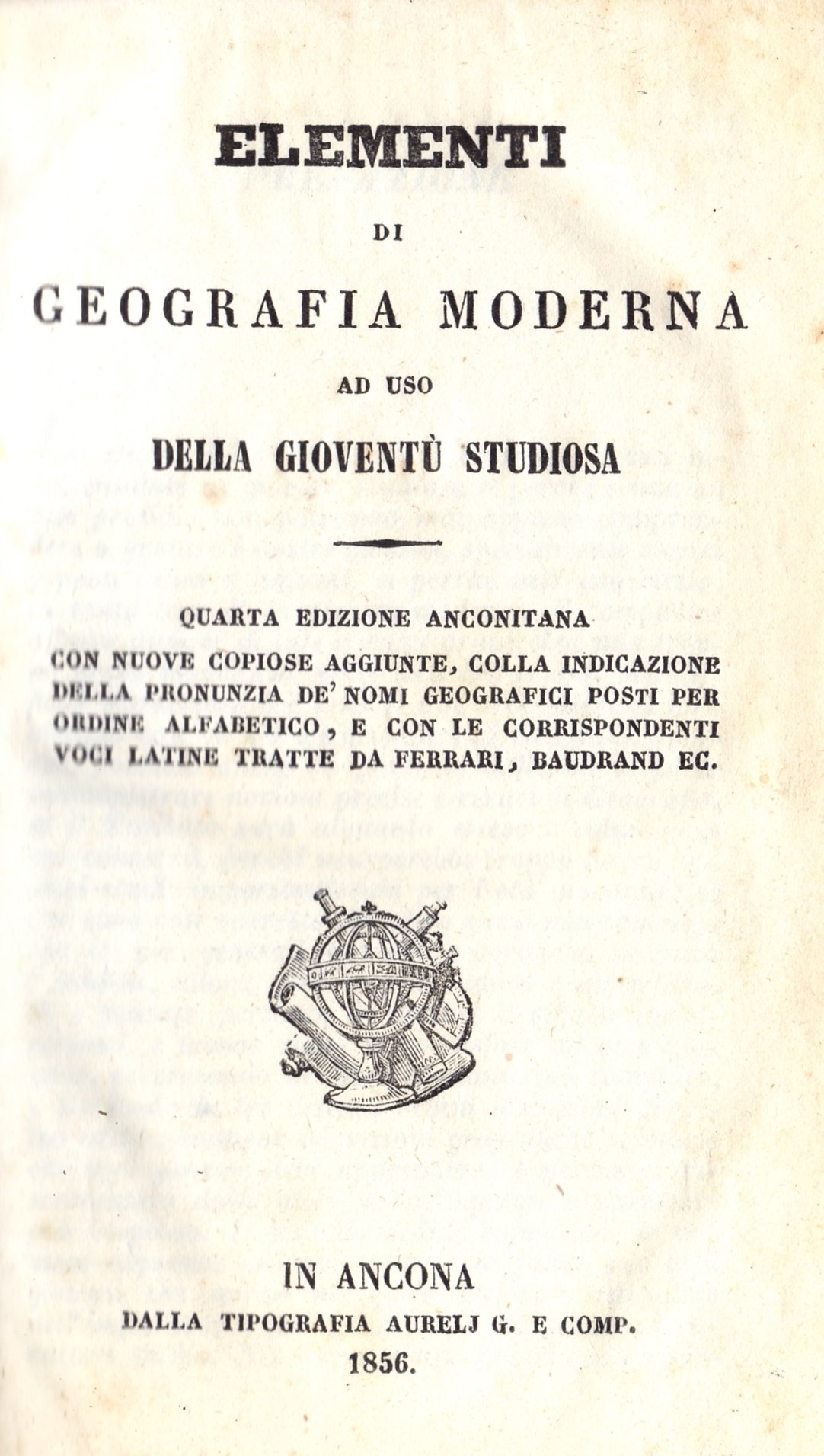 Elementi di geografia moderna ad uso della gioventù studiosa. Quarta edizione anconetana, con nuove copiose aggiunte, colla indicazione della pronunzia de' nomi geografici posti per ordine alfabetico, e con le corrispondenti voci latine tratte da Ferrari, Baudrand ec.