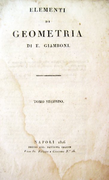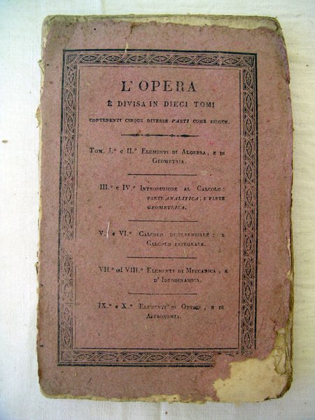 in-4°, cm 23 x 14,5; pp. [4], 156, [4] p., [7] c. di tav. (legate in fondo al testo, più volte ripiegate); leg. in brossura ed. in carta grezza colore rosa con titolo (dell'opera completa in dieci tomi) in nero al piatto ant. entro cornice riccamente decorata, pubblicità editoriale al piatto post. entro stessa cornice (dorso mancante, piatti abrasi, angoli consumati o mancanti); pagine intonse e in barbe, gore d'umido, fioriture, segni d'uso, arricciamenti agli spigoli; tomo secondo di dieci (ma testo completo ed indipendente dagli altri tomi), facente parte di Corso elementare di matematiche pure e miste. Tomo primo [-decimo] / [E. Giamboni]. Rif.: IT\ICCU\RMSE\085272. Cond.: opera poco diffusa, in discreto stato generale.