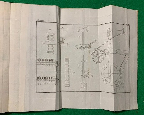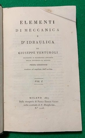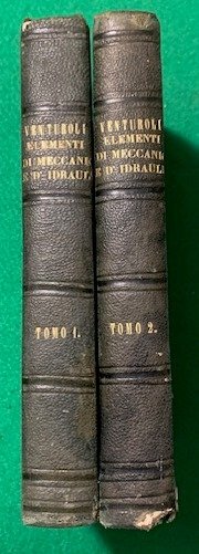 In 8°; due tomi: (12), 416 pp. e 7 c. di tav. fuori testo più volte ripiegate, (8), 397, (3) pp. e 7 c. di tav. fuori testo più volte ripiegate. Legatura in mezza pelle verde con titolo, autore e filetti in oro e a secco al dorso. Piatti foderati in carta marmroizzata verde coeva. Qualche lieve segno del tempo alla legatura, qualche antica sottolineatura in antica matita viola e nel complesso esemplare in buone-ottime condizioni di conservazione. Terza edizione riveduta ed ampliata di questo classico trattato di meccanica ed idraulica del noto ingegnere bolognese, Giuseppe Venturoli (Bologna, 21 gennaio 1768 Bologna, 19 ottobre 1846). Allievo di Conterzani, nel 1790 divenne membro onorario dell'Accademia delle Scienze dell'Istituto di Bologna della quale poi, sarebbe diventato segretario. Venturoli è considerato il capostipite italiano ed il maggior esponente, nella prima metà dell'Ottocento, dell'indirizzo fisico-matematico per lo studio dell'idraulica. Durante la sua vita occupò diverse cariche universitarie fra le quali, dal 1795 quella di lettura onoraria di matematiche all'Università di Bologna, dal 1797 quella di professore sostituto di storia naturale e dal 1802 la cattedra di matematiche applicate nella nuova Università nazionale di Bologna. Fin dai primi anni di lavoro Venturoli, inizia a raccogliere appunti e pensieri per la compilazione di un trattato di meccanica e idraulica, appunti che finiranno per essere la base di quello che diverrà uno dei tratti di meccanica più importanti dell'ottocento, appunto, gli Elementi di meccanica e d'idraulica che pubblicherà in due volumi, usciti, rispettivamenrte, nel 1806 e 1807. Nel 1817 viene invitato dal Papa a Roma per diventare direttore della neonata Scuola degli ingegneri di Roma e presidente del Consiglio idraulico. Nel 1818 istituisce il primo Corpo di ingegneri di Acque e Strade dello Stato Pontificio. Durante la sua vita pubblicò numerose opere su esperienze idrauliche. Si impegna attivamente nella bonifica di vari territori dello Stato Pontificio e venne chiamto, per lo stesso compito, anche nel Granducato di Toscana. Fu anche membro dell'Accademia dei Quaranta. Edizione riveduta, ampliata e corretta di una delle opere di ingegneria più celebri dell'ottocento.