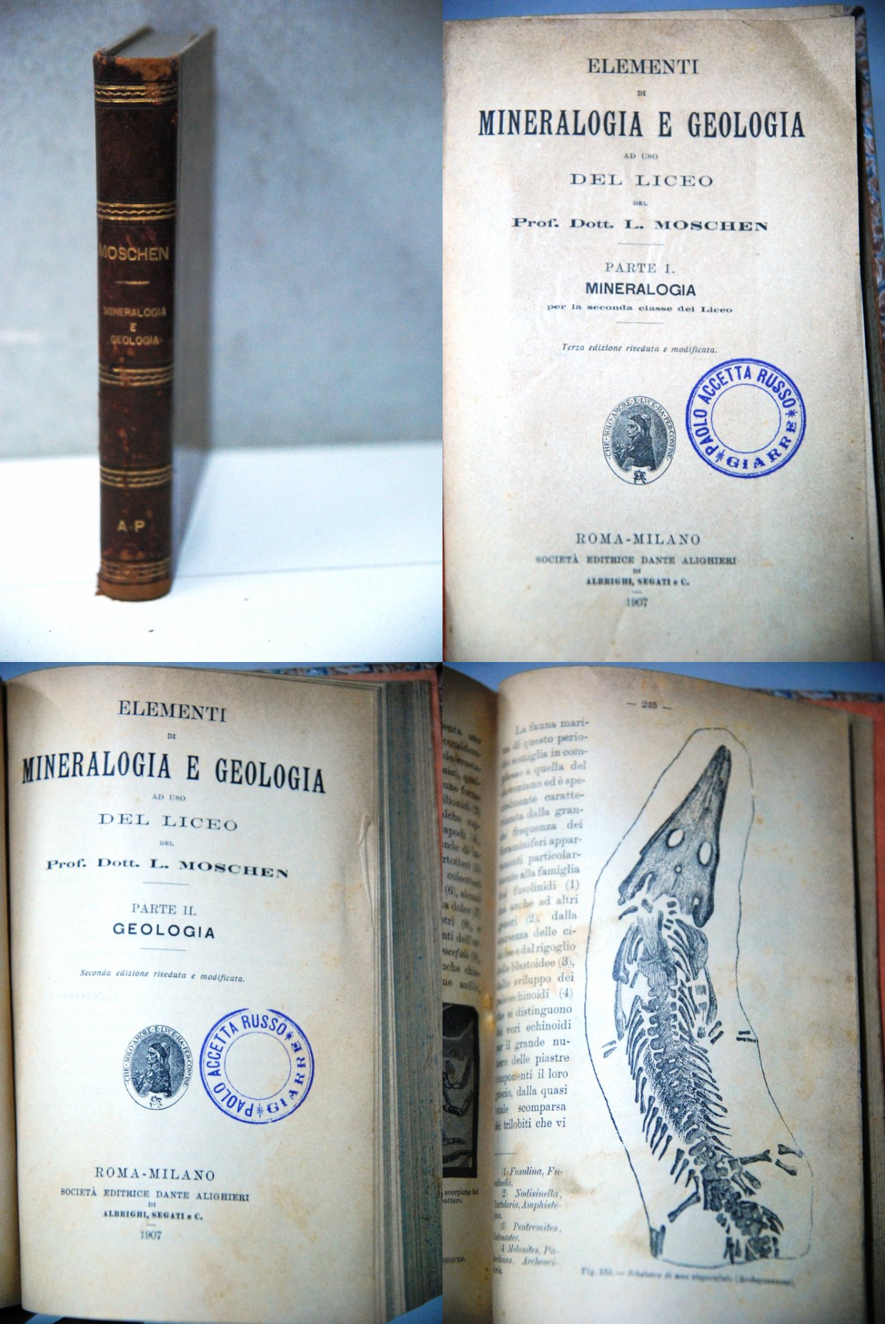 moschen elementi di mineralogia e geologia due parti in un unico volume, opera cpl.. dante alighieri 1907 .
