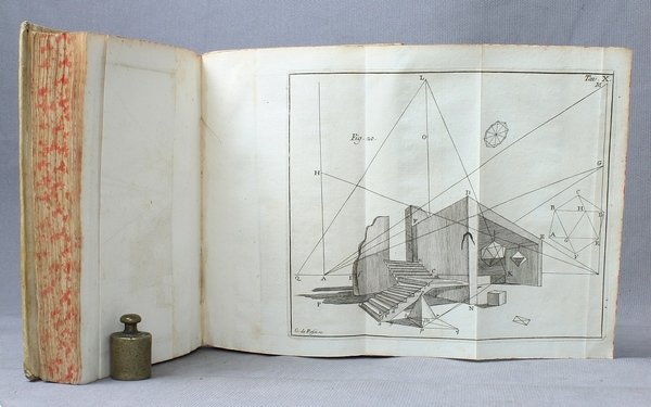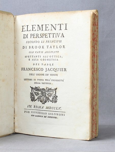 In - 8ø; 8 cc., 145 pp., 1 c. b., 19 tavv. fuori testo ben impresse; legatura coeva in t. pergamena. Ottimo esemplare. Prima edizione. Il francese Fran‡ois Jacquier traducendo in italiano la fondamentale opera di Brook Taylor (1685 - 1731), "Linear perspective" (Londra 1715), amplia e commenta il testo inserendovi importanti aggiunte: "Le aggiunte dello Jacquier sono pregevoli dal punto di vista matematico e riguardante molti casi particolari tra i quali il n. III, ricerca della curva (iperbole) lungo la quale si devono disporre oggetti uguali, affinchŠ appaiano di uguale altezza da un determinato punto di vista." (Vagnetti). Vagnetti EIVb37. Cicognara 840.
