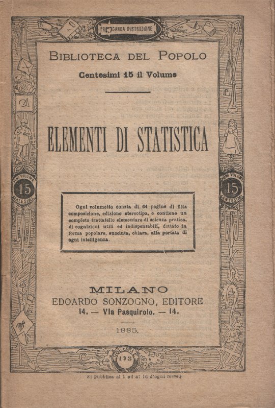 In-16°, pp. 63, (1), copertina editoriale. Firma d'appartenenza a pagina 3. Normale patina del tempo alle pagine, con arrossature dovute al tipo di carta. Per il resto in buono stato. Volume 173 nella collezione "Biblioteca del Popolo". Indice: Parte prima. I. Origine e sviluppo della statistica; II. Metodo della statistica. Parte seconda. I. Divisioni della statistica; II. Statistica territoriale; III. Statistica della popolazione; IV. Statistica economica; V. Statistica politica.