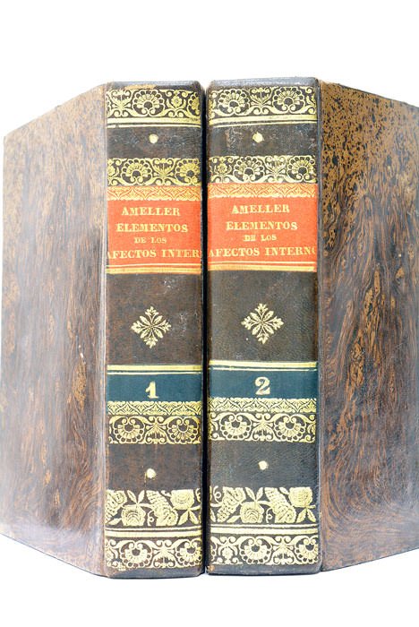 2 tomes en 2 volumes. X. 543 pages. + 656 pages. (17x12 Cm). Plein veau porphyre, dos lisses ornés, pièces de titre et de tomaison en maroquin (reliure de l'époque). Très bon exemplaire Première édition de ce manuel de médecine d'un professeur de Barcelone à l'usage de ses étudiants. Jolie reliure décorative. España. Catalunya.