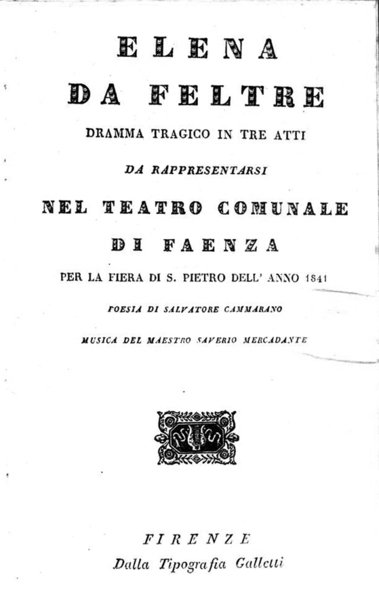Libretto d’opera. La pagina del frontespizio è stata incollata su un’altra. Elenco dei personaggi completo dei nomi degli interpreti tra cui Giuseppina Strepponi e Ettore Profili.