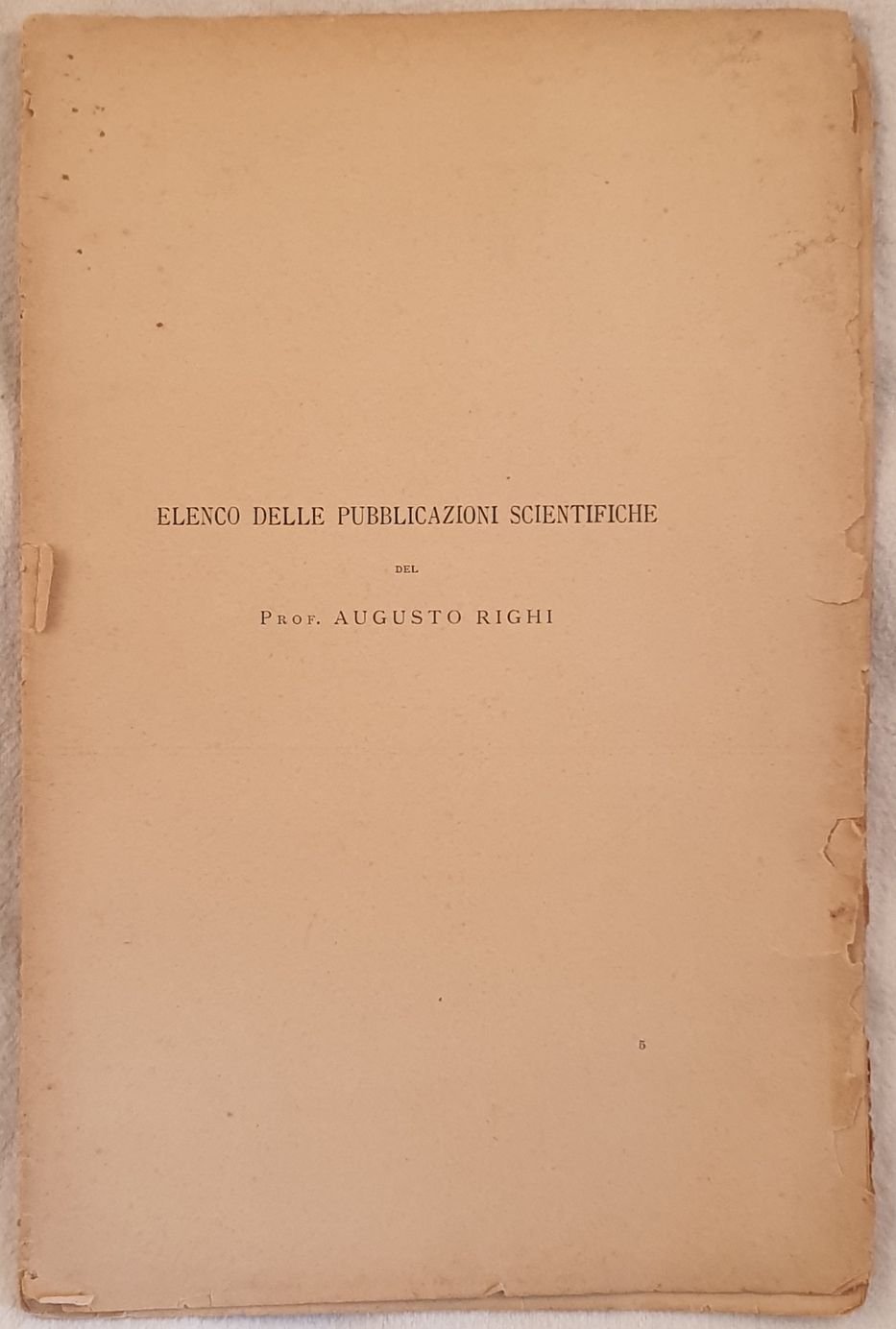 Estratto sul pubblicato del fisico italiano Augusto Righi (1850-1920). L'estratto riporta l'elenco delle sue pubblicazioni fino al 1907. Come ultimo titolo indica "Die moderne Theorie der physicalischen Erscheimungen" in preparazione. In discrete condizioni Coperta assente. Legatura quasi assente. Pagine in discrete condizioni con rare fioriture. Usure marginali. In 8. cm 23,5x15. Pp. da 63 a 90+(4).Extract about the published works of the italian physics Augusto Righi (1850-1920). the extract contains all his works published until 1907. As a last title indicates "Die moderne Theorie der physicalischen Erscheimungen" in preparazione. In fair conditions. Cover is missing. Binding is almost missing. Pages in fair conditions with occasional foxings. Worn edges. In 8. cm 23,5x15. Pp. da 63 a 90+(4).