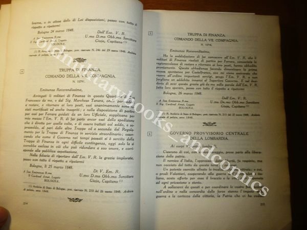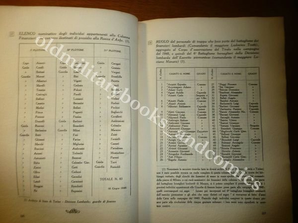 DESCRIZIONE: Quello che stiamo proponendo non è altro che lo stralcio delle ultime pagine del volume sopracitato, e vanno da pag. 209 a pag. 352, completo per la parte citata. Questo stralcio propone: - elenco di tutti i finanzieri impiegati nelle varie fasi della campagna militare per l'unificazione d'Italia dal 1848 al 1866 - riproduzione di tutti i documenti inerenti l'impiego delle truppe della Guardia di Finanza - è presente anche la traduzione della lettera (in francese nel testo) di Callimaco Zambianchi al comandante in capo dell'Esercito Francese in Italia - telegrammi, rapporti, ordini di servizio etc. CONDIZIONI DELL'OGGETTO: Ottime, la prima pagina, con la scritta documenti è staccata dal resto dello stralcio. PESO/WEIGHT: 264 g without package