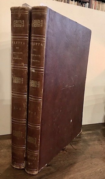 Folio (cm. 44), 4 Tomi legati in 2 Voll.; 53 cc.nn. e 36 tavv.; 47 cc.nn. e 37 tavv.; 4 cc.nn. e 6 tavv. f.t. (di cui 4 a doppia pagina), 14 pp., 42 cc.nn. e 32 tavv. f.t.; 3 cc.nn. e 5 tavv. (di cui 3 a doppia pagina), 8 pp., 62 cc.nn. e 39 tavv. (di cui 4 a doppia pagina). Tutte le tavole sono in litografia da disegni di C. Bettini, F. Becchetti, L. Aurelj ed altri. Frontespizi decorati con vignetta centrale in ciascun volume. Legature coeve in mz. pelle nocciola con fili, fregi e titoli impressi in oro al ds. (lievi tracce d’usura perlopiù marginali). Ingialliture sparse ma nel complesso esemplare fresco ed in ottimo stato di conservazione. Non comune, specialmente quando completo del quarto ed ultimo Tomo pubblicato nel 1844 da un diverso editore. Nel nostro esemplare è presente un numero complessivo di 155 tavole. Dall’Indice sembrerebbe assente una tavola tuttavia, dalla catalogazione di ICCU, gli esemplari censiti presentano un numero complessivo di 146 tavole. Provenienza: Collezione Moretti, Roma (timbretti ex libris sulle carte d’occhietto e sui frontespizi).