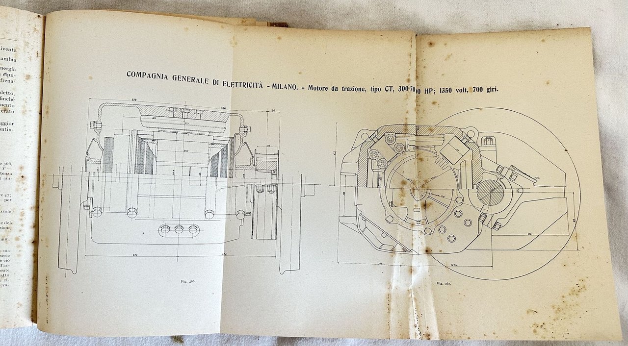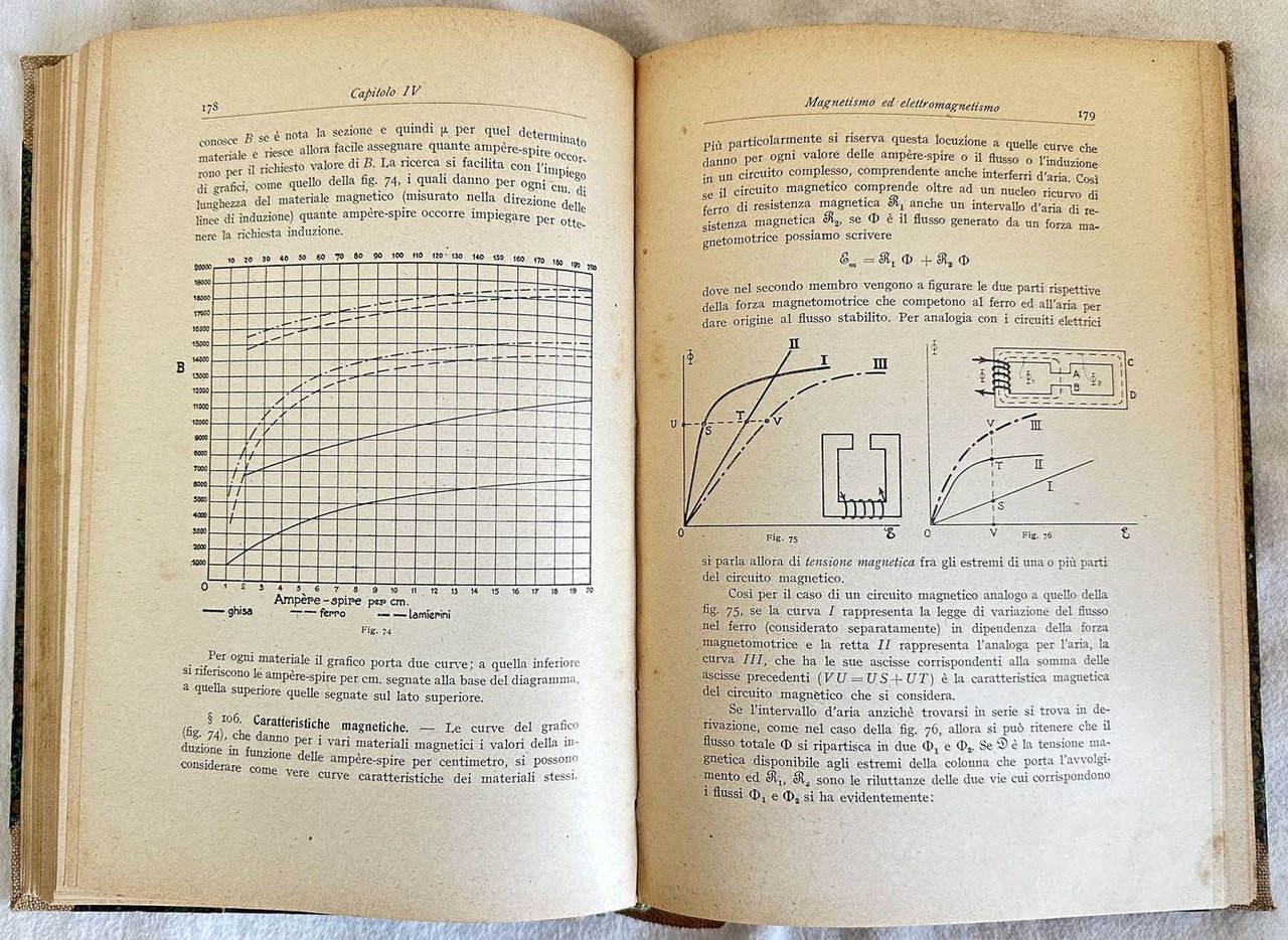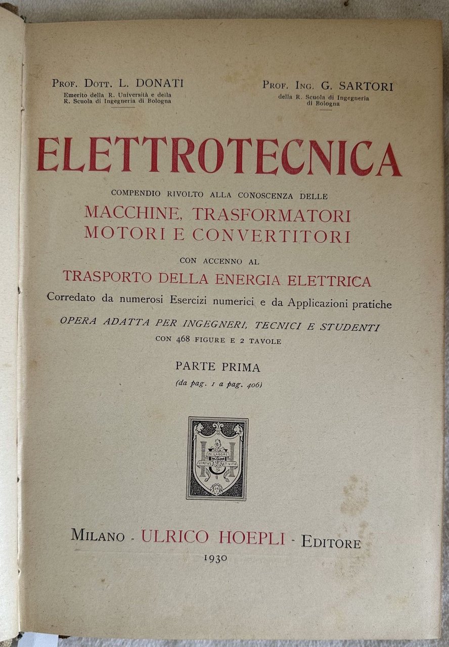 Edizione del 1930 di questo manuale Hoepli di elettrotecnica per le macchine, trasformatori motori e convertitori scritto da Donati e Sartori. Accenno al trasporto della energia elettrica. All'interno: richiami di elettrostatica, Correnti permanenti, Elettrolisi, Magnetismo ed elettromagnetismo, Correnti indotte, Dielettrici e condensatori, Unità elettriche, Correnti alternative, Circuiti, Trasformatori statici, Macchine dinamo elettriche, Dinamo a corrente continua, Dell'armatura a tamburo in particolare, Corrente polifasi, Dinamo a corrente alternativa, Motori elettrici a corrente continua, Motori sincroni, Motori a corrente alternata, Motori a campo Ferraris, Convertitrici rotative, Motori a collettore per correnti alternative, Trasmissione dell'energia elettrica ecc. Numerose figure nel testo e tavole ripiegate. Firma all'occhietto e prima carta bianca. In buone condizioni. Copertina in mezza tela con titolo su tassello al dorso in buone condizioni con usure. Tassello al dorso del secondo tomo. Legatura in buone condizioni. Pagine in buone condizioni generali con fioriture. In 8. Dim. 23x16,5 cm. Pp. XVI+1022. Peso kg. 2.Edition of 1930 of this Hoepli manual of electrotecnics for cars, trasnformers engines and convertors written by Donati e Sartori. Informtation tot eh transport of electric energy. Differemt illustrations in the text and folded plates. Signature in the first title page and first blank page. In good conditions. Half cloth cover with gilted title in the spine in good conditions lightly worn in the extremities. Title leather label missing in the spine of second tome. Binding in good general conditions. Inside pages are in good conditions with foxing. In 8. Dim. 23x16,5 cm. Pp. XVI+1022. Peso kg. 2.