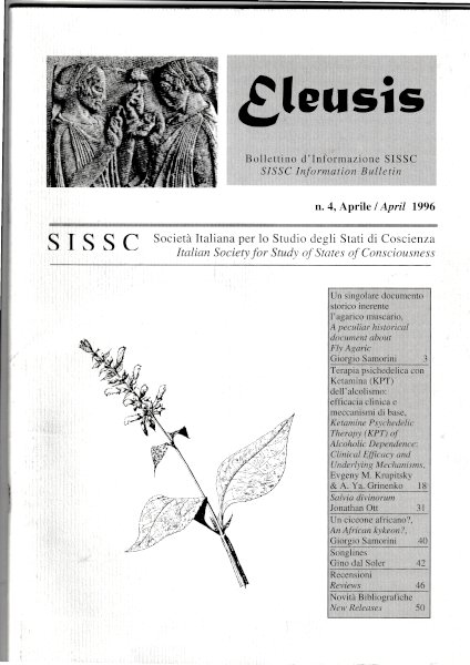 Brossura con punti metallici (cm 29,5x21) pag. 50. con illustrazioni in b/n -- Indice: Un singolare documento storico inerente l'agarico muscario. Giorgio Samorini - Terapia psichedelica con Ketamina (KPT) dell'alcolismo: efficacia clinica e meccanismi di base. Evgeny M. Krupìtsky & A. Ya. Grinenko. - Salvia divinorum. Jonathan Ott.- Un ciceone africano? Giorgio Samorini - Songlines. Gino dal Soler.