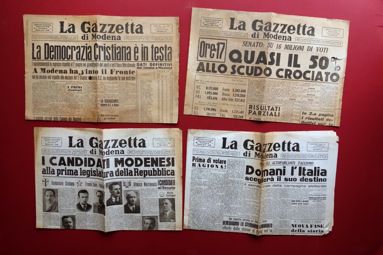 Modena, 15-20 aprile 1948; 4 numeri di giornale di pp. 2-4 ciascuno, con prime pagine e ampi spazi interni dedicati alle elezioni politiche del 1948; il numero del 15 aprile mostra e reca una breve biografia di tutti i candidati modenesi per le varie forze politiche in campo. Completi. Dimensioni: cm 57x42,5.