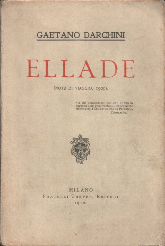 In-16° (cm 19,2x12,6), pp. (8), 253, (3), copertina editoriale. Buon esemplare. Indice: Sul mare d'Ulisse; La Grande Idea; Un imperatore piccolo e un grande poeta; Ancora sul mare d'Ulisse; I Greci son Greci?; Grammaticume; Tristezze d'eroi e di poeti; L'isola de' poeti (Zante, Zacinto); Olimpia; Sui per l'Alfeo; Dall'Acropoli al Campidoglio; Politicume; Letteratume; Delfo; Alle eteore; Le Termopili; Le città della Tragedia; A Sparta; Sull'Egeo.