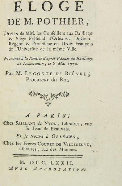 Eloge de M. Pothier, Doyen de MM. les Conseillers aux Bailliage & Siège Présidial d'Orléans, Docteur Régent & Professeur en Droit françois de l'Université de la même ville.