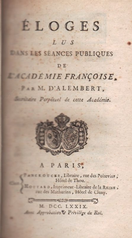 In-16° (cm 16 x 10), legatura ottocentesca i mezza pelle con filetti in oro al dorso liscio, e titolo su tassello (in parte mancante); pp. XXXIV-vj-559(5). Graziose vignette xilografiche come testatine, e altrettanti finalini. Contiene gli elogi di Massillon, Despréaux, Abbé de Saint-Pierre, Bossuet, Abbé de Dangeau, De Sacy, La Motte, Fénelon, Abbé de Choisy, Destouches, Fléchier, Crébillon, Présidente Rose; e Dialogue de la reine Christine et de Descartes, Note sur ce dialogue, Discours sur les prix en 1771 e 1772. Edizione originale, inottimo stato di conservazione.
