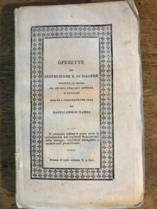 [vt] Della collana "Operette di instruzione e di piacere scritte in prosa da celebri italiani antichi e moderni scelte e pubblicate per cura di Bartolommeo Gamba". Dall'indice: Elogio di Pietro Antonio Micheli scritto da A. Cocchi, di Celestino Galiano, scritto da A. Buonafede, di Raimondo Montecuccoli scritto da A. Paradisi, di Giuliano Cassiani, scritto da Luigi Cerretti, di C.I. Frugoni, scritto da P. Salandri, di Anton Mario Lorgna, scritto da L.Palcani, di Giuseppe Torelli scritto da I. Pindemonte. Piccoli strappetti al dorso inf. e sup, qualche fioritura alle pagine, molto buono nel complesso. Pagg. 214,1. Brossura edit. Mis mm 170x105