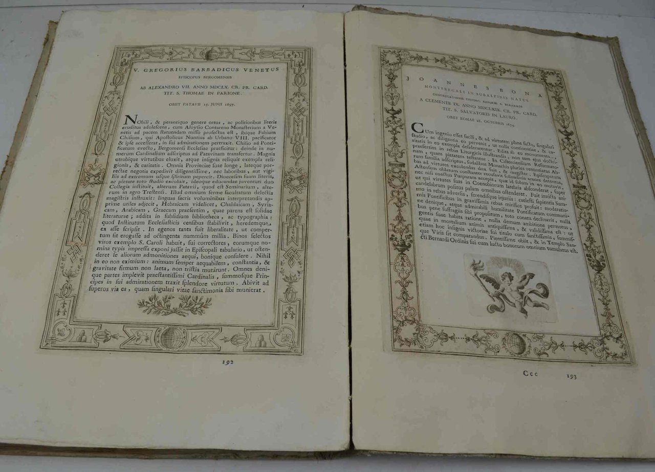 Cm. 44, pp. (26) 200 (10). Antiporta raffigurante una seduta del Concilio di Trento, bel frontespizio inciso (inc. F. Morghen) ed ogni pagina racchiusa in una elegante bordura xilografica. Nel testo oltre 150 figure incise in rame con fregi decorativi e amorini. Legatura strettamente coeva in cart. alla rustica. Qualche brunitura ma bell'esemplare, ad ampi margini e stampato su carta forte. Unica edizione di quest'opera che si può considerare un vero capolavoro dell'arte tipografica settecentesca, impresso con grande sfarzo. Citato dal catalogo Dura, Libri delle Belle Arti. L'autore, cardinale bolognese, presenta una raccolta di elogi di illustri ecclesiastici e da prova della sua grande attenzione per il "bello artistico". Oltre all'attività svolta a favore della chiesa Monti si dedicò infatti a varie collezioni soprattutto di libri e stampe che lasciò in legato all'istituto di Bologna. Fa spicco nel suo lascito una impareggiabile raccolta di ritratti di dotti italiani e stranieri.