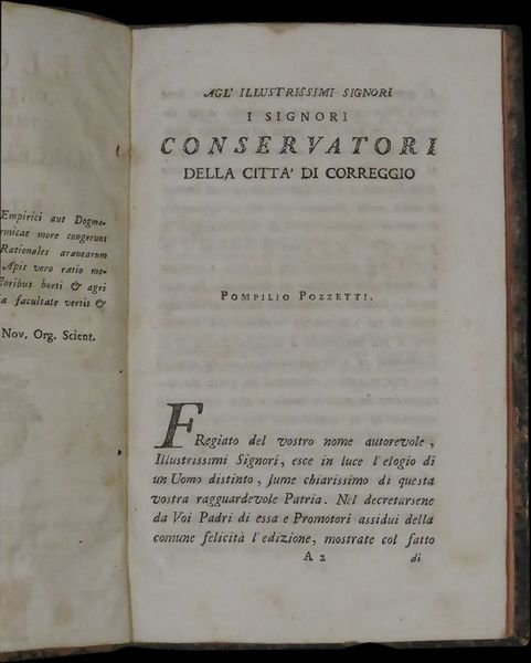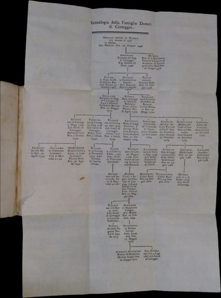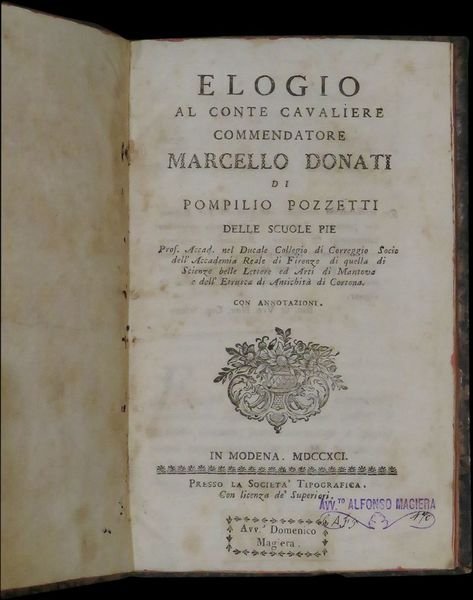 In 8° (19,8×12 cm); 68, (4) pp. e una c. di tav. più volte ripiegata con albero genealogico della Famiglia Donati di Correggio. Legatura coeva in piena pelle marmorizzata con dorso a 4 nervi e pecetta con titolo manoscritto da mano ottocentesca ad un tassello. Tagli rossi. Alcune lievissime bruniture alle prime carte. Antichi pecetta e timbretto di proprietà privata al frontespizio che attestano l'appartenenza del volume prima, all'avvocato Domenico Magiera e poi all'avvocato Alfonso Magiera, ambedue appartenente all'antica famiglia ebrea di origini polacche dei Magiera. Dedicatoria "Agl'Illustrissimi Signori I Signori Conservatori Correggio scritta dal mirandolese, Pompilio Pozzetti (Mirandola 16 gennaio 1760 - Bologna 17 aprile 1815). L'autore, allievo di Giulio Bulgarelli, si formò inizialmente presso i gesuiti prima e alla soppressione dell'ordine, presso le Scuole Pie. Studiò filosofia e matematica a Firenze. Nel 1778 fu trasferita a Cortona come pubblico maestro d'umanità. Tornato a Firenze fu poi bandito dal granduca Leopoldo I, probabilmente a causa di alcune maldicenze, tanto che dopo alcuni anno, riconosciuta la sua innocenza, fu lo stesso granduca a richiamarlo. Nel 1789 fu chiamato dal duca Ercole III d'Este per dirigere il Collegio di Correggio. " professore onorario dell'Università (20 aprile 1793) quindi bibliotecario dell'Ateneo (9 luglio 1793) e professore straordinario di storia (20 novembre 1794). Il 6 giugno 1794, alla morte dell'erudito Girolamo Tiraboschi, fu chiamato alla guida della Biblioteca Estense, che diresse in solido con l'abate Carlo Ciocchi, secondo bibliotecario con il quale non corse mai buon sangue; a loro si affiancò, in qualità di terzo bibliotecario, Antonio Lombardi che nel 1807 prese il posto dello stesso Pozzetti [ ] Nel 1803 rifiutò la proposta di una cattedra all'Università di Vilnius, di cui fu nominato professore onorario pur non svolgendovi alcun insegnamento (15 febbraio 1804). Il 27 settembre 1806 venne inviato alla Biblioteca universitaria di Bologna come probibliotecario. [ ] Raggiunta la nuova sede, iniziò a compilare l'inventario di cui l'istituto aveva bisogno, e il 5 gennaio 1807 ne assunse la direzione. Contemporaneamente fu designato alla cattedra di storia e diplomatica dell'Università, mantenendola dal 5 gennaio 1807 al 15 novembre 1808, data in cui l'insegnamento fu soppresso, per essere reistituito e affidato di nuovo a Pozzetti il 28 aprile 1814. Nel 1808 declinò l'offerta di dirigere il Collegio dei nobili di Modena e nel 1811 venne insignito del titolo di professore emerito, divenendo l'anno dopo storiografo ufficiale dell'Ateneo bolognese. ". L'opera ricostruisce la vita del celebre medico mantovano ma nato da una delle più importanti famiglie di Correggio, Marcello Donati (Mantova 1538 - Mantova 1602), nipote di Pietro Pomponazzi che personaggio di ampia cultura, si interessò di latino, greco, spagnolo, francese e anche filosofia, eloquenza, letteratura latina, greca e italiana anche se i suoi studi accademici si indirizzarono verso la medicina, appresa prima a Mantova sotto la direzione di Francesco Facini, medico del duca Guglielmo Gonzaga e poi, a Padova dove si laureò nel 1560. "Non ancora ventiquattrenne, fu ammesso all'Accademia degli Invaghiti, prima come "segreto", poi, a ventisei anni, venne designato quale vicerettore. Si poteva così fregiare del titolo di cavaliere in forza del privilegio concesso da papa Pio IV. Di quella Accademia fu in seguito rettore, dal 1576 al 1599, e in quella sede lesse lavori suoi di letteratura, poesie e dissertazioni su vari argomenti. La medicina rimaneva tuttavia il suo campo specifico di studio e di attività". Amico di Alfonso Pacio, conobbe anche Ulisse Aldrovandi. Donati fu autore di numerose testi medici, letterari e storici. Si interessò anche di botanica tanto da creare, nel giardino della propria casa un ampio parco botanico, ricco di esemplari provenienti dal nuovo mondo delle quali lo stesso studioso, testò le proprietà medicinali. Nel 1587 fu nominato dal duca Vincenzo Gonzaga conte e feudatario del Castello di Ponzano nel Monferrato con titolo trasmissibile ai discende denti. L'anno prima aveva pubblicato la sua opera più celebre che ebbe numerose riedizioni e diverse traduzioni, De medica historia mirabili " ampia raccolta di casi clinici e di osservazioni anatomiche personali, di autori antichi, arabi, medievali e contemporanei, tra le prime del genere, anticipatrice di quella tendenza alla compilazione di ampie casistiche clinichee anatornopatologiche che nel XVIII secolo avrà il suo massimo autore in Giovanni Battista Morgagni. Il D. fu il primo, tra l'altro, a descrivere l'ulcera gastrica in cadavere e l'edema cosiddetto di Quincke". RIf. Bibl.: IT\ICCU\CFIE\021628.
