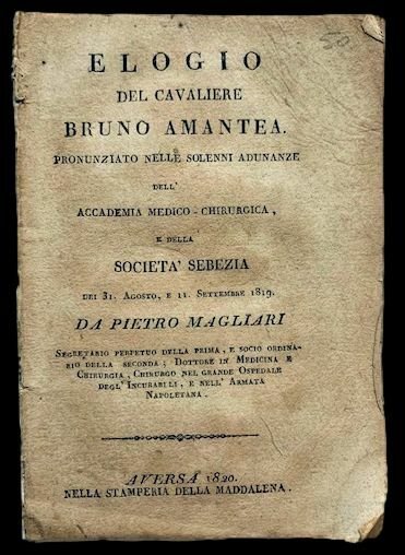 In 8°; 32 pp. Senza brossura ma non slegato. Probabile prima edizione, ne uscirono tre nello stesso anno, di questo elogio del noto chirurgo e fisico cosentino, Amantea Bruno (circa 1750 10 April 1819). Allievo a Napoli di Domenico Cotugno, Sabato Mauro e Nicola Franchini a lui si deve un noto trattato sulla rimozione dei calcoli dalla vescica. Durnate la sua lunga carriera eseguì interventi chirurgici per ernia, cataratta e aneurismi poplitei. Nel 1792 ottenne la cattedra di Anatomia presso l'ateneo partenopeo. Nel 1798 fu nominato capo chirurgo dell'esercito napoletano a Sangermano. Alla Restaurazione, Re Ferdinando I lo nominò chirurgo reale. Opera non comune scritta dal noto scienziato, membro dell'Accademia delle Scienze di Torino, Magliari Pietro (1783 - 1858).
