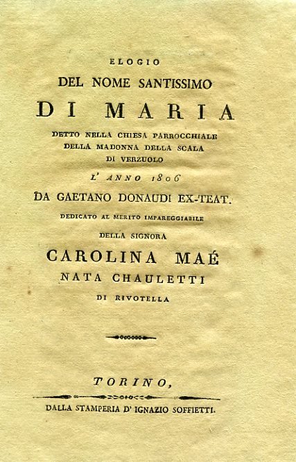 Elogio del Nome Santissimo di Maria detto nella Chiesa Parrocchiale della Madonna della Scala di Verzuolo l'anno 1816. Dedicato al merito impareggiabile della Signora Carolina Maé nata Chauletti di Rivotella