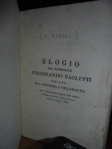 U. NOBILI. ELOGIO DEL SACERDOTE FERDINANDO PAOLETTI PIEVANO DI S. DONNINO A VILLAMAGNA CON L'ESTRATTO DELLE SUE OPERE FORMATO SUL PRINCIPIO DELL'ANNO 1802. [PROB. FIRENZE, S.N.T., C. 1802], IN-8°, LEGATURA COEVA IN CARTONCINO COLORATO, PP. [II], 107, [3]. CON ERRATA AL RECTO DELL'ULTIMA CARTA. ESEMPLARE BEN CONSERVATO. NEG. ESOT. MOB. 101