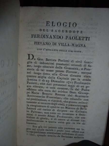 ELOGIO DEL SACERDOTE FERDINANDO PAOLETTI PIEVANO DI S. DONNINO A VILLAMAGNA CON L'ESTRATTO DELLE SUE OPERE FORMATO SUL PRINCIPIO DELL'ANNO 1802.