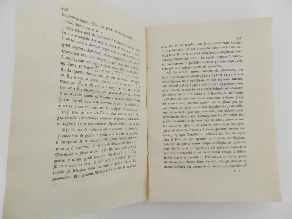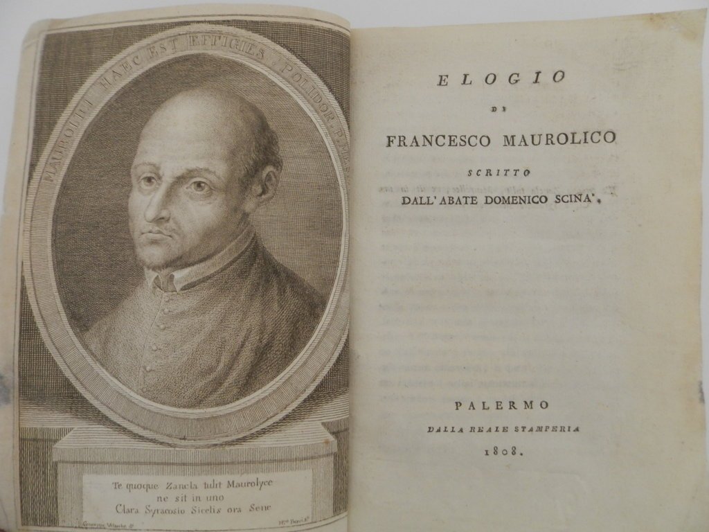 4°, mm 210 x 145, pp. 224 e 1 tavola di ritratto all'antiporta, brossura coeva. Normali segni del tempo per il resto ottimo esemplare senza la tavola finale che lo stesso Mira (II, 346) non cita nella sua Bibliografia Siciliana. Approfondito apparato di note. Interessante monografia scritta dall'abate, fisico e storico italiano Domenico Scinà (1765 - 1837) sulla figura del Maurolico (1494 - 1575) nome di rilievo del panorama scientifico del Cinquecento; illustre matematico e astronomo, intuì e sviluppò il principio di induzione matematica, studiò metodi per la misurazione della Terra, fece osservazioni astronomiche, fornì le carte geografiche alla flotta cristiana in partenza dal porto di Messina per la Battaglia di Lepanto. Accurati furono i lavori di ricerca su Archimede e quelli che portarono alla pubblicazione di una delle sue opere più importanti la Cosmographia, stampata a Venezia per L. Giunti nel 1543. *** TUTTI I NOSTRI LIBRI SONO VISIBILI PREVIO CONTATTO MAIL O TELEFONO NELLA NUOVA SEDE DI MILANO: LIBRERIA COSMOPOLIS, VIA JOMMELLI, 22. ***