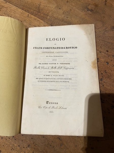 Elogio di Frate fortunato da Rovigo infermiere cappuccino del secolo decimosettimo, letto da Luigi gaiter p.veronese a Verona il 4 maggio 1840 nel quale fu dedicato nel convento medesimo un pubblico monumento alla sua memoria. Libretto ben conservato, leggermente ingiallito ma pagine leggibil e sfogliabili.