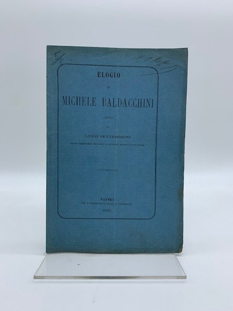 <span class="a">In 8, cm 15 x 22, pp. 16. Brossura editoriale. Probabile invio autografo dell'autore al piatto anteriore. Settembrini, in questa commemorazione estratta dagli Atti della accademia di scienze morali., riprende il discorso sul </span><span class="a">Purismo, sulla sua necessita' storica e sulle sue esagerazioni, quando si propo</span><span class="a">neva una lingua per la quale «dovevi lasciar di cercare cio' che oggi si fa e si </span><span class="a">cerca in Europa.'. Baldacchini fu autore di versi, novelle e ricerche storiche</span>