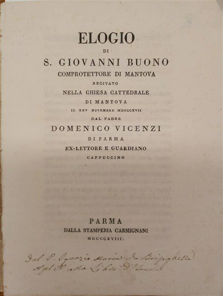 ELOGIO DI S. GIOVANNI BUONO comprotettore di Mantova, recitato nella Chiesa Cattedrale di Mantova il XXV Novembre MDCCCXVII dal Padre. di Parma ex-lettore e guardiano Cappuccino.