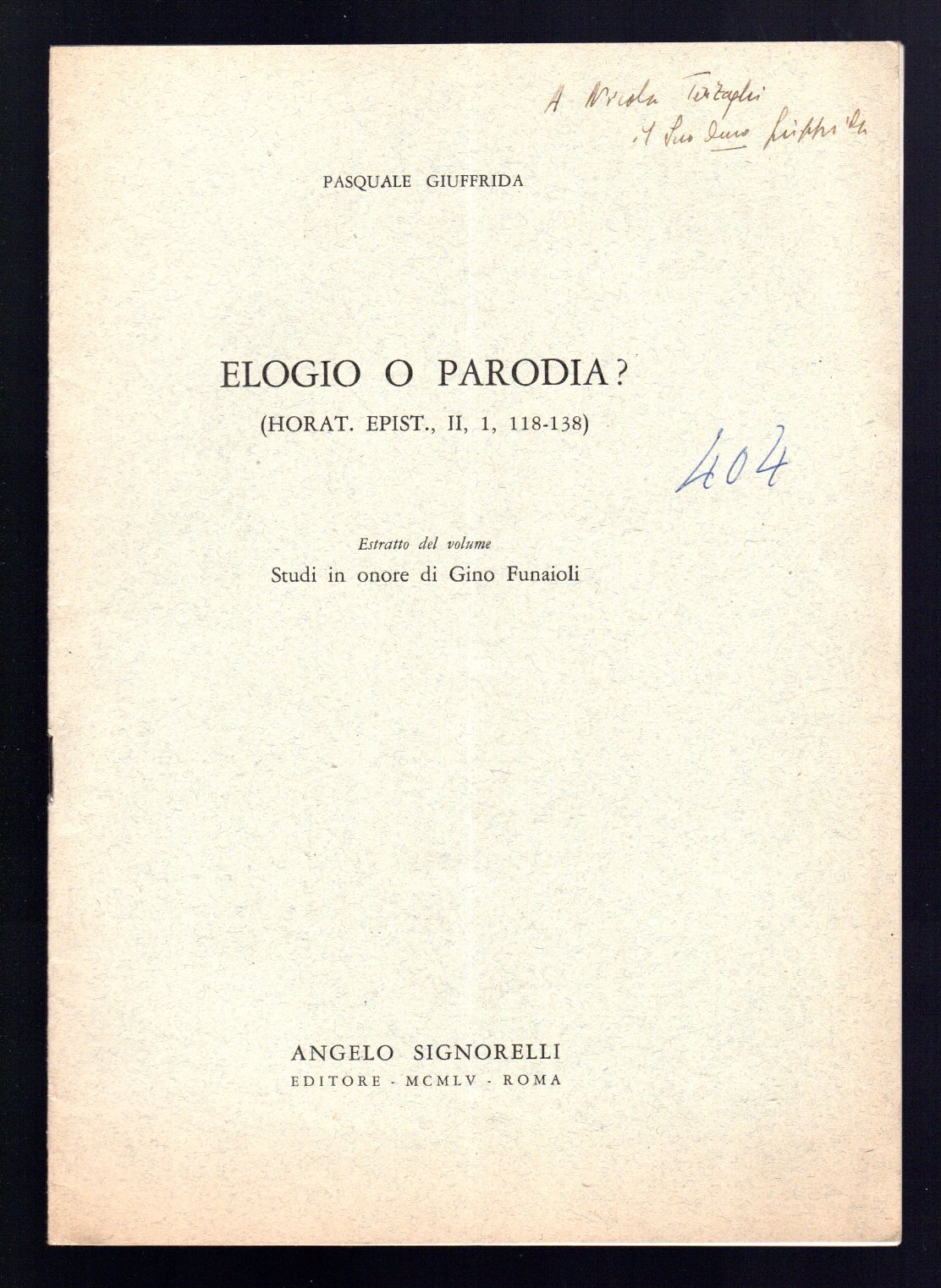 Opuscolo vintage. Estratto dal volume Studi in onore di Gino Funaioli. Dedica autografa. Segni di biro in copertina. usura da scaffale. Ordinario segno del tempo.
