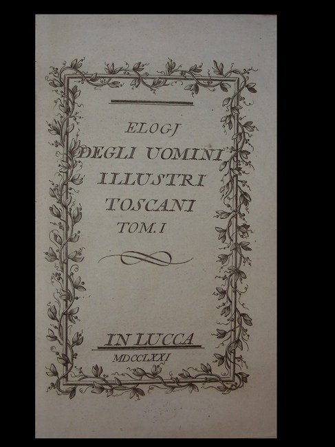 4 voll. in-8 gr., pp. (6), CCCLXXXVIII; (4), CCCXC; (4), CCCC; (4), 2, (4), DCCCXLVII (gli ultimi 2 voll. hanno num. cont. in caratteri romani), bella leg. cart. rust. coevo con tit. ms. ai d. Front. entro elegante cornice e 4 antip. Su ciascun vol. antip. allegorico inc. in rame da B. Eredi su dis. di S. Pacini. Testat. e final. inc. in rame. Seconda rara edizione sulla prima in folio del 1761-73, l'opera contiene le biografie di più di 200 personaggi illustri di Toscana per cura di vari autori tra cui il fiorentino Giuseppe Pelli. Moreni I, 339, nota. Seconda ediz. Moreni I p. 339. Manca a Lozzi. Belliss. esempl. [056]