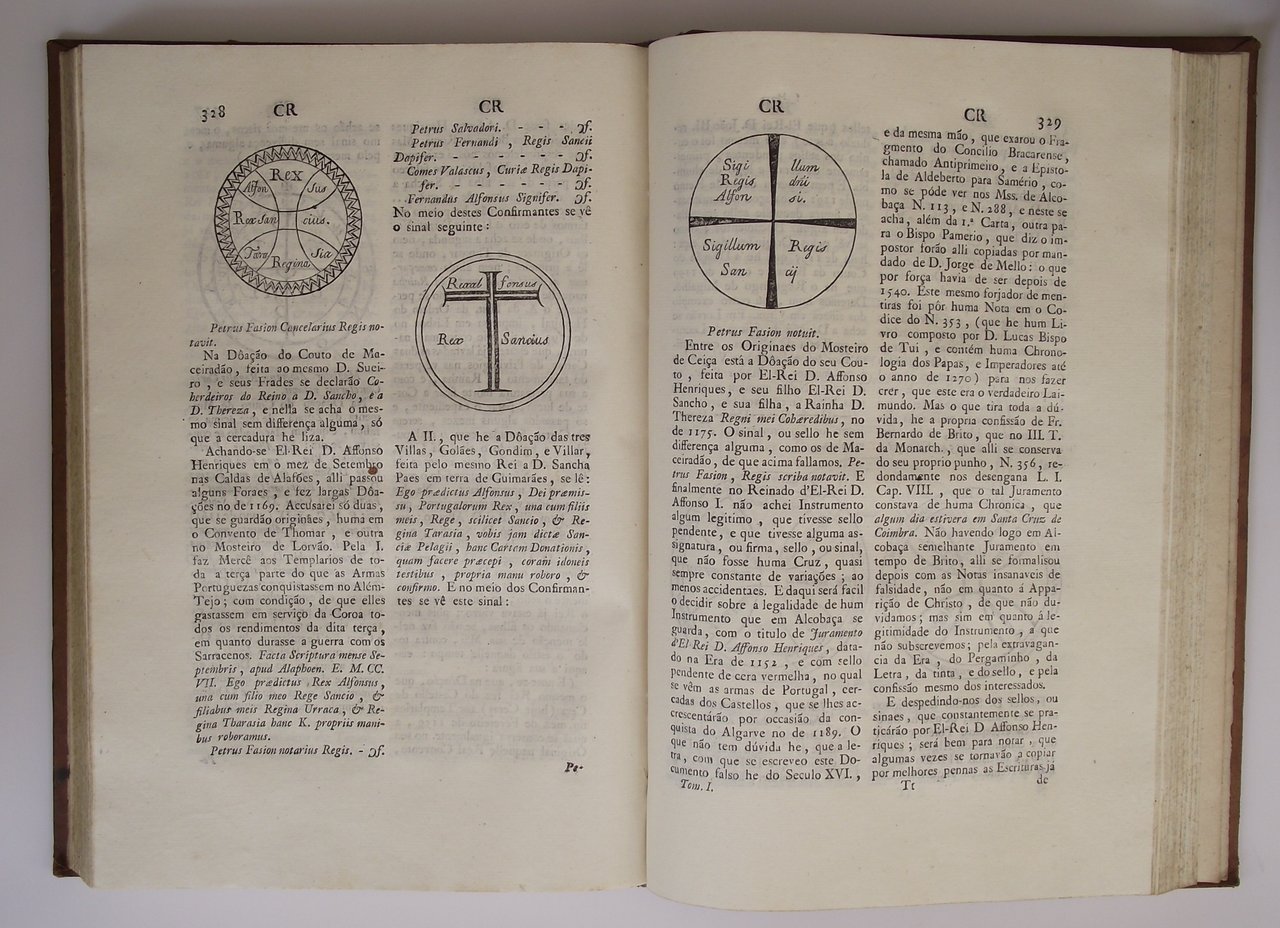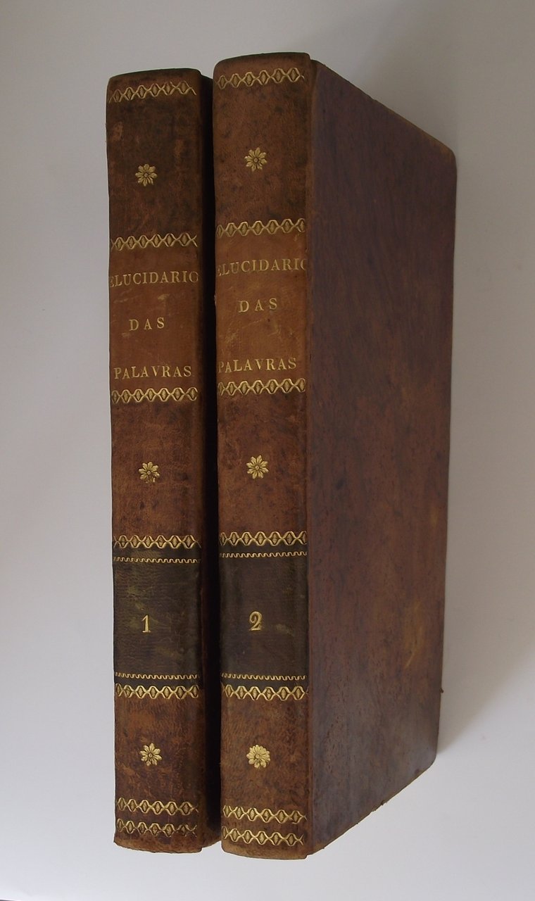 Due volumi di cm. 29,5, pp. (4) 484 + (2) d'errata; pp. 416, 62 + (2) d'errata. Con illustrazioni nel testo e 5 tavole f.t. incise in rame. Solida legatura del tempo in piena pelle, dorsi lisci con fregi e titoli in oro su doppi tasselli. Come riscontrato in altri esemplari, il secondo volume è stampato su carta azzurra. Esemplare fresco, genuino ed in eccellente stato di conservazione. Esemplare appartenuto al celebre scrittore di storia portoghese Prospero Peragallo (1823-1916) di cui appare ai frontespizi la firma di possesso ed alle carte di guardia alcune note sull'opera: "Rarissimo in commercio e molto ricercata questa edizione. Mi costò in un incanto in Lisbona 10.000 Rey...".