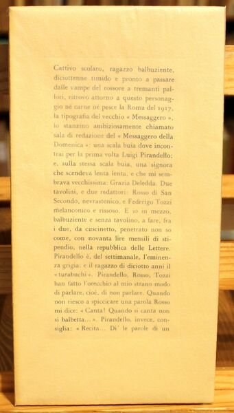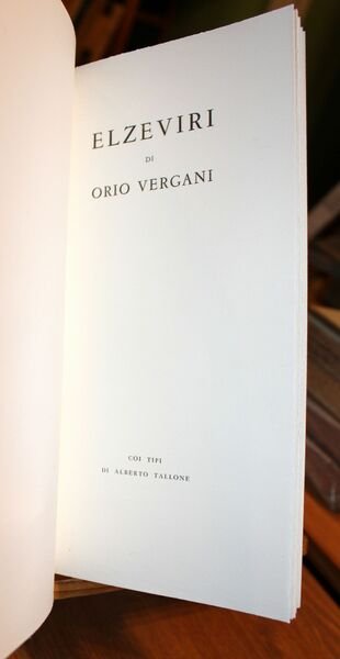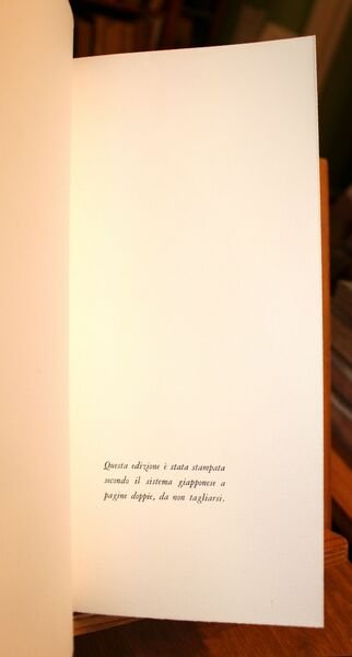 In 8° stretto (mm. 262 x 136), pp. 84, (10) stampate secondo il sistema giapponese, a pagine doppie. Brossura editoriale con risvolti, protetta da velina e custodia di colore ocra. Stato di nuovo. Tiratura di 575 esemplari composti con caratteri Tallone. Copia delle 560 su carta Magnani di Pescia.
