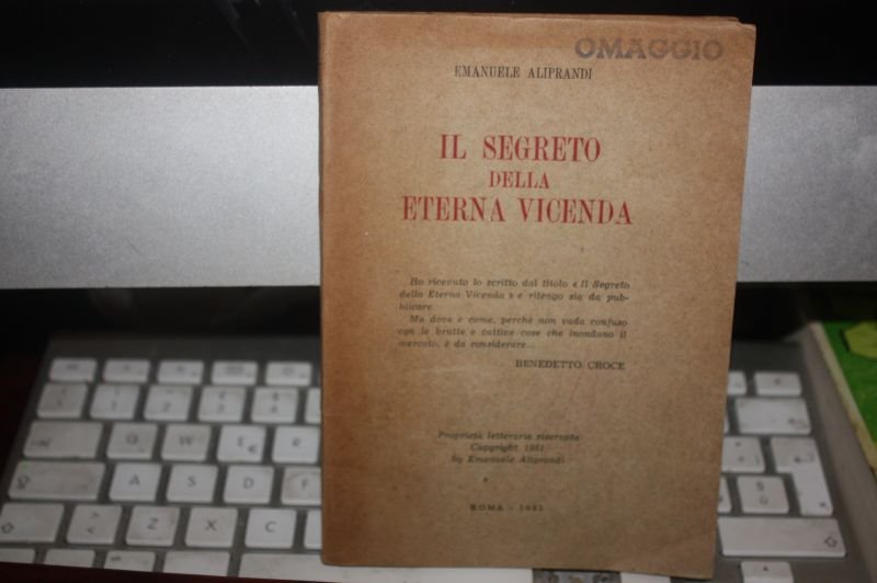CODICE 3117, , , EMANUELE ALIPRANDI, IL SEGRETO DELLA ETERNA VICENDA., A, , E.ALIPRANDI (ARTI GRAF."S.BARBARA"DI UGO PINNARò), 1951, , 16°. pp. 99 (1). Br. edit. Timbretto omaggio alla cop. ant. Timbretto privato dell'Aliprandi alla cop.post., L'edizione riporta sulla cop. ant. il commento di Benedetto Croce: "Ho ricevuto lo scritto dal titolo "Il Segreto." e ritengo sia da pubblicare. Ma dove e come. perchè non vada confuso con le brutte e cattive cose che inondano il mercato. è da considerare."