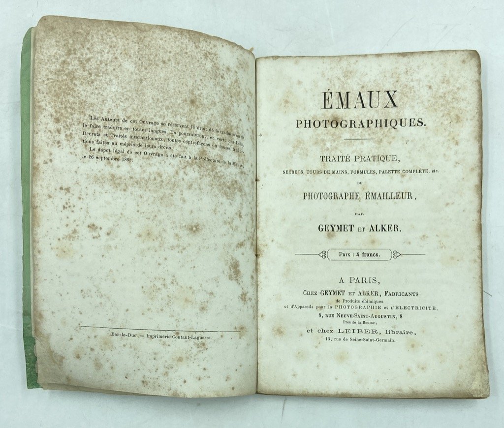 ÉMAUX PHOTOGRAPHIQUES. Traité pratique, secrets, tour de mains, formules, palette complète du PHOTOGRAPHE ÉMAILLEUR par Geymet et Alker. A PARIS, Chez GEYMET et ALKER, Fabricants de Produits Chimiques et d’Appareils pour la PHOTOGRAPHIE et l’ÉLECTRICITÉ, et chez LEIBER, Libraire.