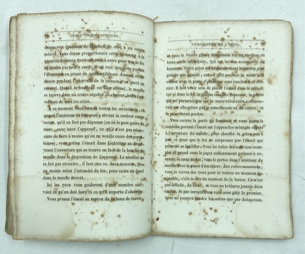 Brossura editoriale a stampa, 12mo cm 20x12, pp (4) 125 (3). Esemplare da studio, macchiette e segni d’uso sulla brossura, diffuse fioriture e gore, piccole mancanze marginali su alcune carte, integrazioni sui bordi della brossura e del frontespizio. Edizione originale. Manuale dedicato alle sostanze e tecniche necessarie per il trasferimento di immagini fotografiche al collodio su supporti ceramici smaltati. L’opera fu composta Théophile Geymet e Charles Alker, chimici francesi titolari di un’azienda di prodotti per la fotografia e l’elettricità fondata a Parigi nel 1867; Alker aprì nel 1870 una succursale dell’azienda in Belgio, e si dedicò allo sviluppo della galvanoplastica. Non comune.