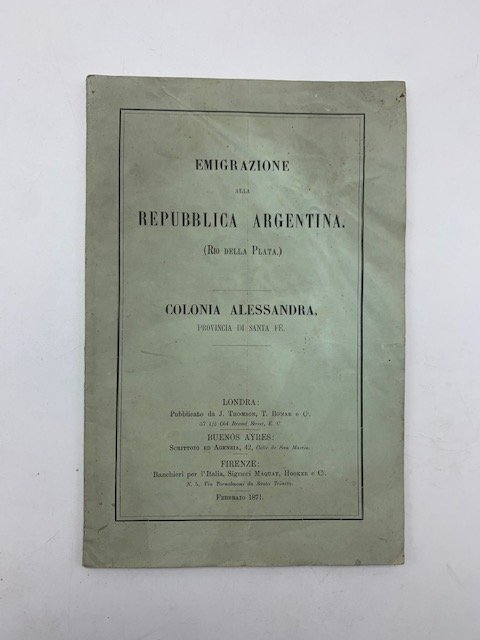 In 8 (cm 14 x 21,5), pp. 18 con 1 tavola finale ripiegata con 2 cartine. Lieve segno di stazzonatura al piatto anteriore. Brossura editoriale. Pubblicazione propagandistica che pubblicizza la colonia Alessandra ai fini di facilitare l'emigrazione italiana in terra d'Argentina: "I signori J. Thomson, T. Bonar e compagnia avendo fatto l'acquisto di un'amplissima estensione di terreni nella Repubblica Argentina, avvertono quelli che hanno l'intenzione di emigrare con ristretti capitali, offrirsi loro una bella occasione di ottenere la proprieta' di terre e stabilirvisi, vantaggiosamente poste in quella Repubblica. Il terreno acquistato consta di 60,687 ettari circa, e trovasi nella provincia di Santa Fe', sulla riva occidentale del fiume San Javier tributario del Parana. Sono visibili due carte che dimostrano la posizione del tenimento chiamato la Colonia Alessandra.". Segue quindi una breve relazione dei principali prodotti coltivabili in Argentina e notizie sulla tassazione. Briani, "Italian Immigrants Abroad. A Bibliography on the Italian Experience Outside Italy in Europe, the Americas, Australia, and Africa", p. 106.