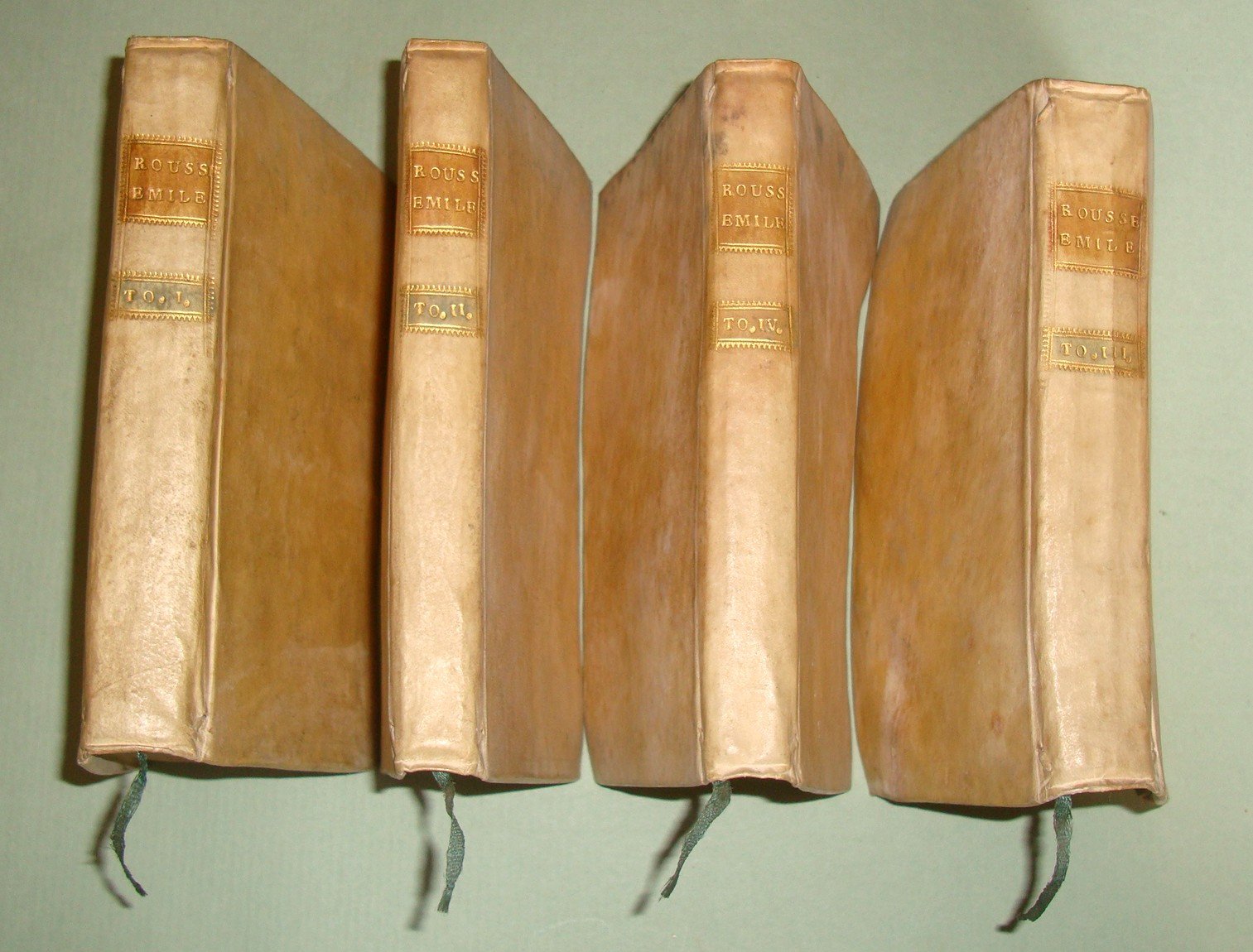 ROUSSEAU J.J. Emile, ou l'education. Geneve, 1792. 4 volumi in 16mo; cc. 2 n.nn., pp. 338; 255; 376, 272. 5 tavole incise in rame a piena pagina. Pergamena coeva, tassello ai dorsi con titolo e fregi in oro.