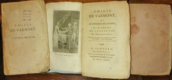 In-8 (14 cm) 3 voll 160;(1) c. (antiporta) 174; 191 (1).Occhietto con titolo: "Emilie De Varmont ou Le divorce necessaire". Brossura editoriale, con mancanze ai dorsi, assente il piatto anteriore del primo volume. Varie fioriture. French language. Lingua francese