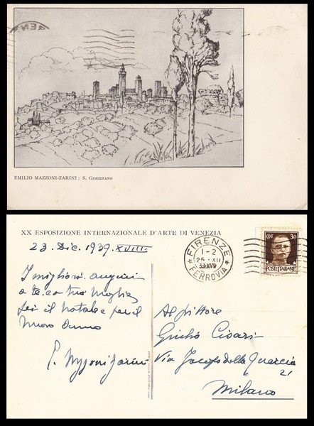 cartolina manoscritta e firmata da Emilio Mazzoni Zarini datata 23 dicembre 1939 e spedita a Giulio Cisari riproducente al verso una sua opera (edita in occasione della XX Esposizione Internazionale d'Arte di Venezia); ottimo es.
